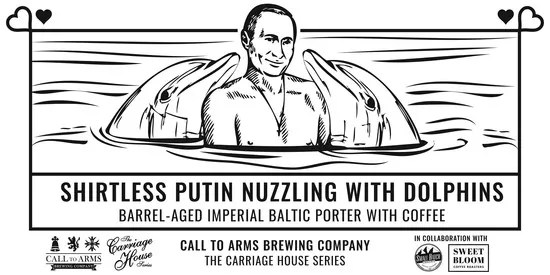 Call to Arms Brewing brings back Shirtless Putin Nuzzling With Dolphins in bottles and on draft at 3 p.m. This 11.7 percent bourbon barrel-aged imperial Baltic porter was brewed with Sweet Bloom Coffee and “offers flavors of vanilla, oak, and chocolate covered cherries,” the brewery says. “You can’t un-see the imagery of a scantily clad Vladimir cuddling up to these friendly mammals of the sea,” adds the brewery’s Chris Bell. “It’s a bold image fit for a bold beer.” Shirtless Putin Nuzzling With Dolphins was brewed with Czech Pils yeast and started as the brewery’s Shirtless Putin on a Horse. Seven different malts were blended and used in the original brew, along with the addition of Bravo hops. The beer was then aged in Four Roses bourbon barrels for months. Coffee was added as the finishing touch. There are only 400 bottles available.