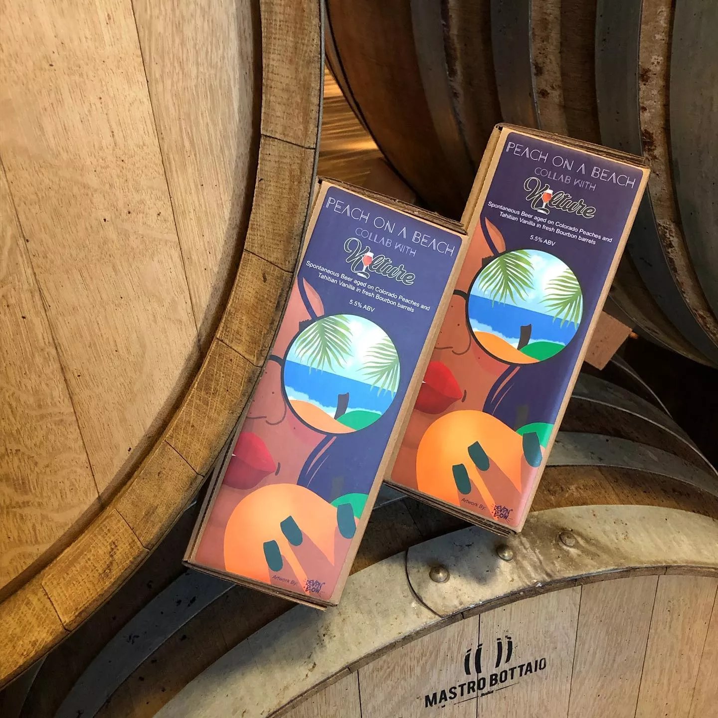 The beer that Primitive just released, Peach on a Beach, is a blend of spontaneously fermented beers aged for up to three years in Buffalo Trace Bourbon barrels and infused with Colorado-grown Allstar Peaches and Tahitian vanilla beans. Uncarbonated, or “flat,” Peach on a Beach was packaged in Primitive’s unusual bag-in-a-box packaging, a tradition with Belgian roots. Primitive ships these beer boxes to 21 states.
