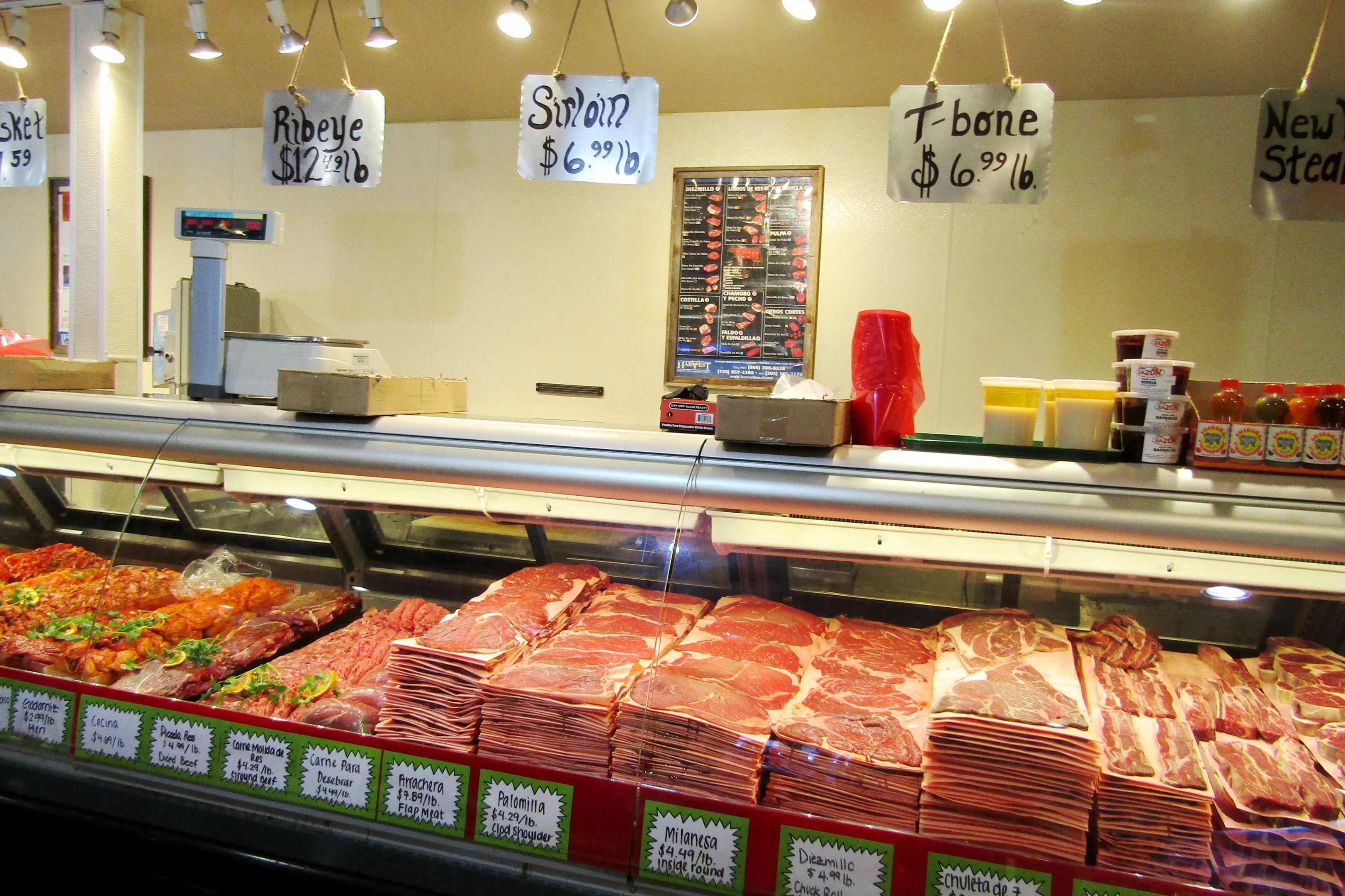 But unlike many other aging retail centers, this one sports a fresh coat of near-surgical white paint, as well as fresh customers that Beltran’s is bringing to the area. The meats don’t sit for very long at the butcher counter before those customers snap them up, and the restaurant in the back maintains a busy pace through much of the day.