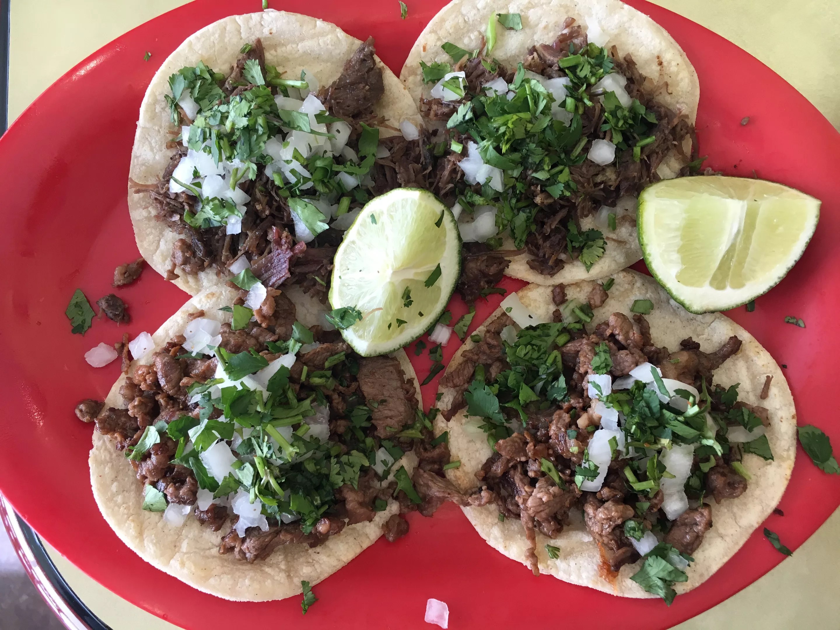 Tacos with carne asada (bottom) and barbacoa (top).