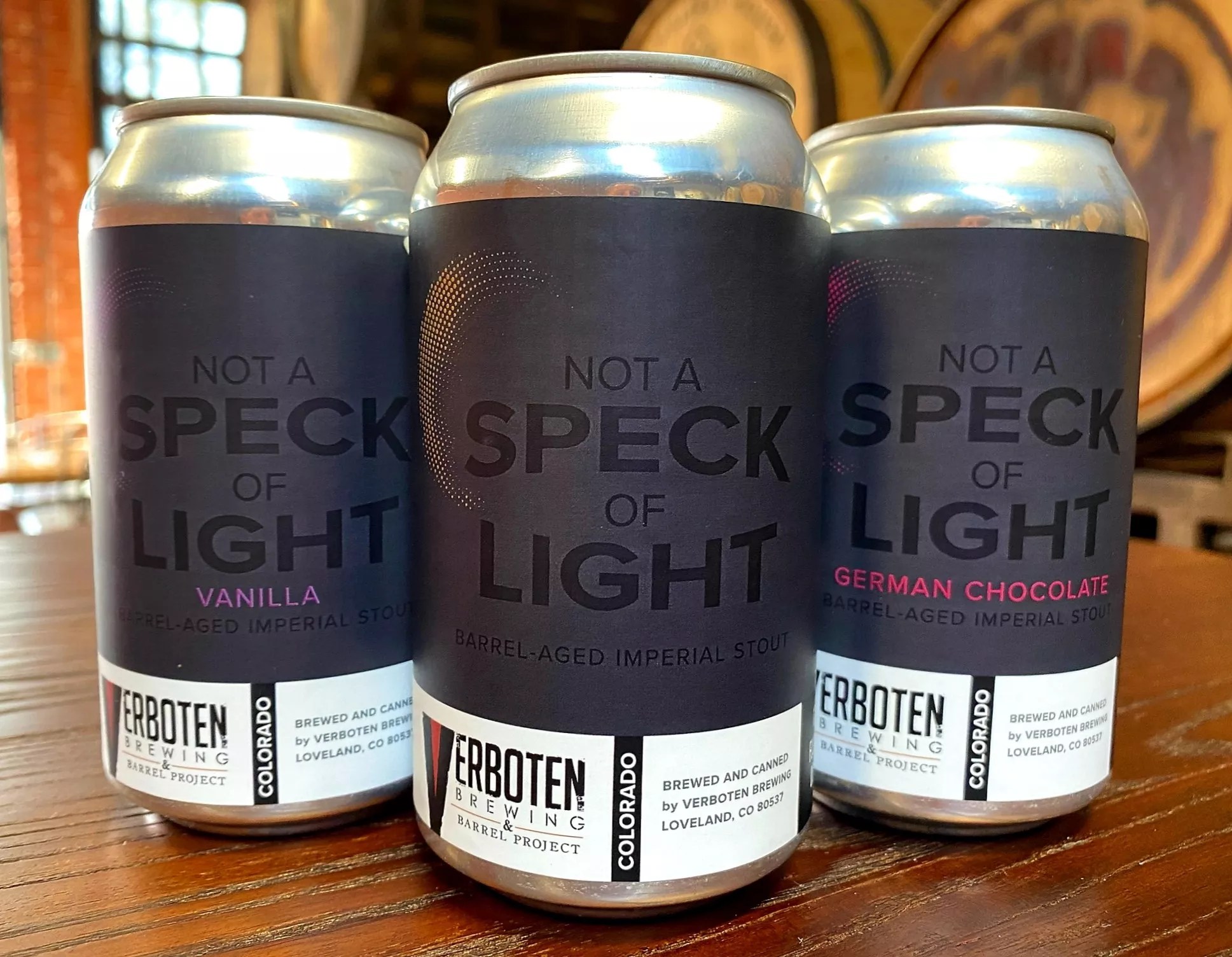Join Verboten Brewing in Loveland for the release of its newest barrel-aged imperial stout, Not a Speck of Light, along with two variants. The 13.5 percent ABV beer was brewed with Golden Promise, caramel and chocolate malts and Belgian candi sugar, then boiled for six hours. After that, it sat for more than a year in bourbon barrels, giving notes of molasses, marshmallow, coconut and dark fruits, the brewery says. The first variant had both Tahitian and Ugandan vanilla beans added, while the second, Not a Speck of Light German Chocolate, has toasted coconut flakes, Ghanaian cocoa husks and pecan. All three beers will be available on tap and in two-pack cans to go. Verboten has been making award-winning barrel-aged beers since 2013.