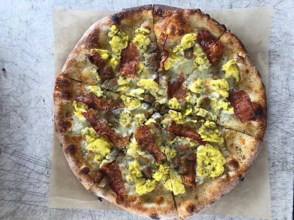 Who’s the best judge of cauliflower in all of ‘Murica? Us, that’s who: National chain Chipotle has tapped Denver as one of just two test markets (the other? Wisconsin) for its new menu item, cauliflower rice. Now you can get your baby-arm-sized burrito with grilled and riced cauliflower – seasoned with lime juice, cilantro and salt – rather than the familiar seasoned white rice that took the town by storm nearly thirty years ago. Call ahead to your nearest location to ensure that it’s offering the menu item (just 54 restaurants in the country are hawking the brassica) and be prepared to pony up a $2 surcharge for a taste. This green chile pie from Tilford’s Pizza at Edgewater Public Market is topped with eggs, chiles and bacon or sausage. Courtesy Edgewater Public Market