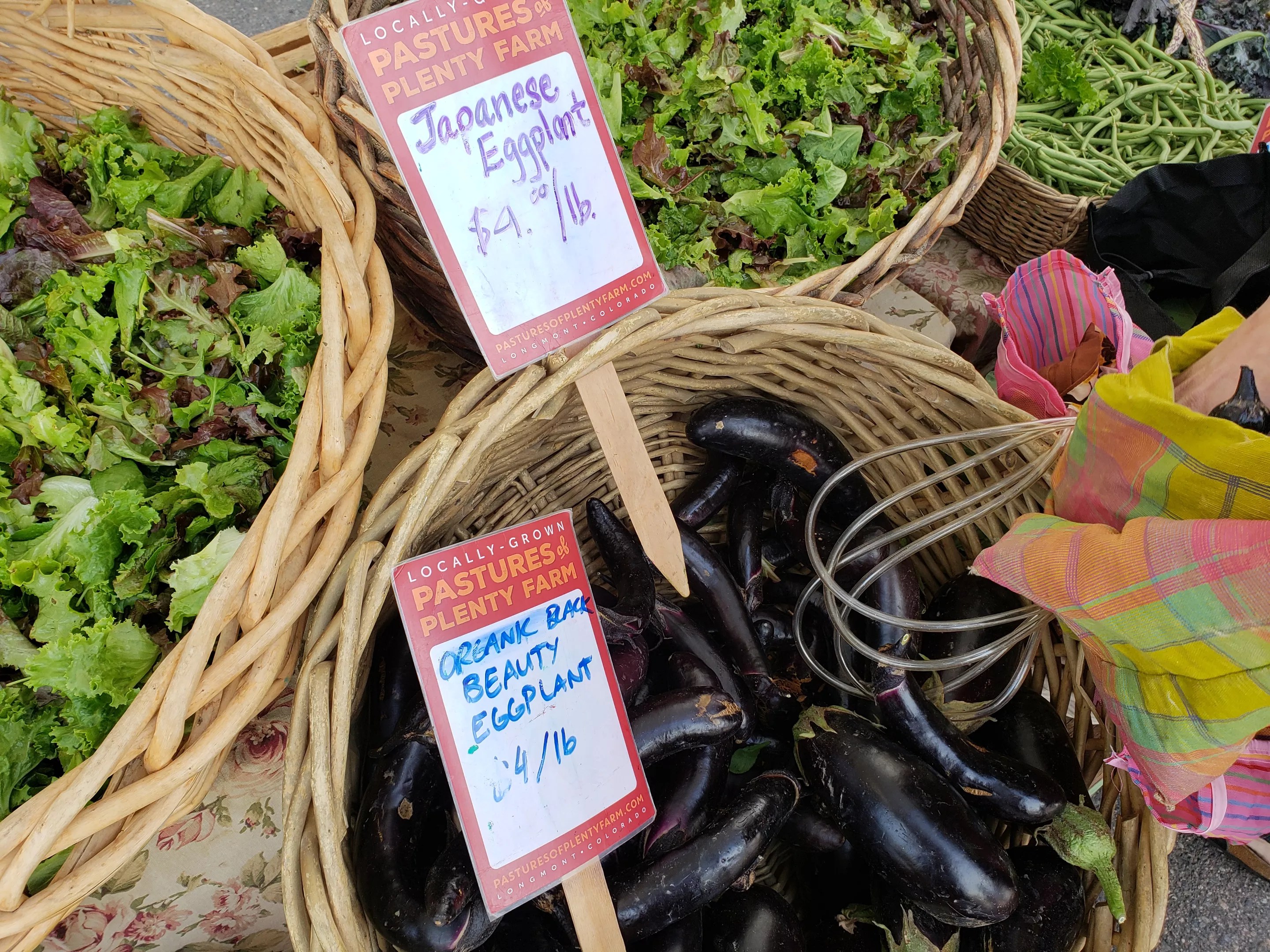 Pastures of Plenty Farm grows glossy aubergine eggplants.