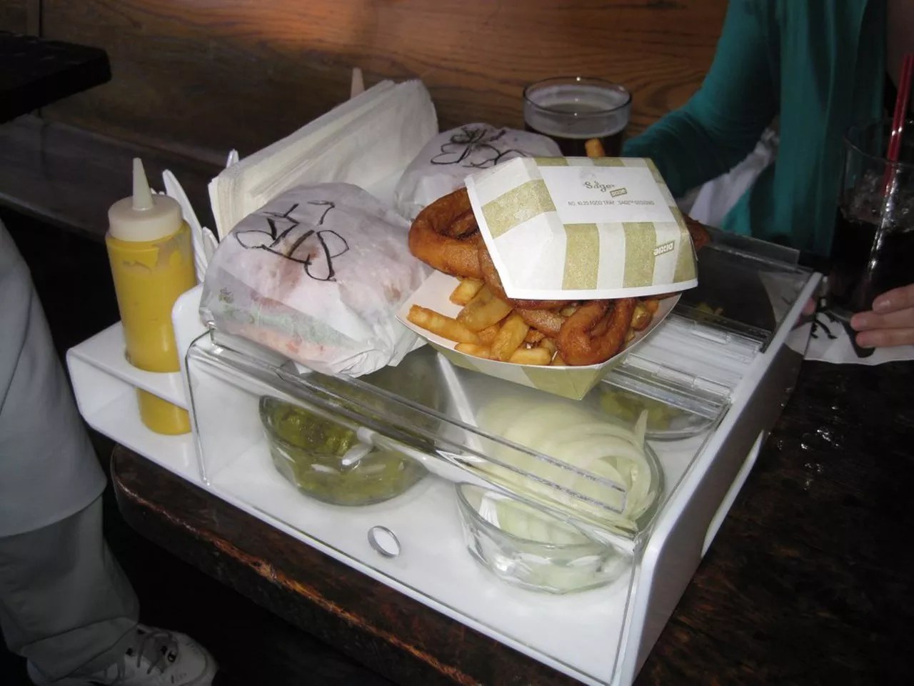 If you want to get crazy, Crave is the place to do it. Sure, you can stick with the Plain Jane and be happy, but why not try the Fatty Melt, which cradles a beef patty between two grilled-cheese sandwiches, or the infamous Luther, which uses two doughnuts instead of a bun? Other outlandish toppings include whole jalapeño poppers, pulled pork, grilled pineapple and hot dogs. You’ll be craving a couch after a burger at Crave. The burger and condiment caddie at My Brother’s Bar is one of Denver’s most familiar sights. Westword