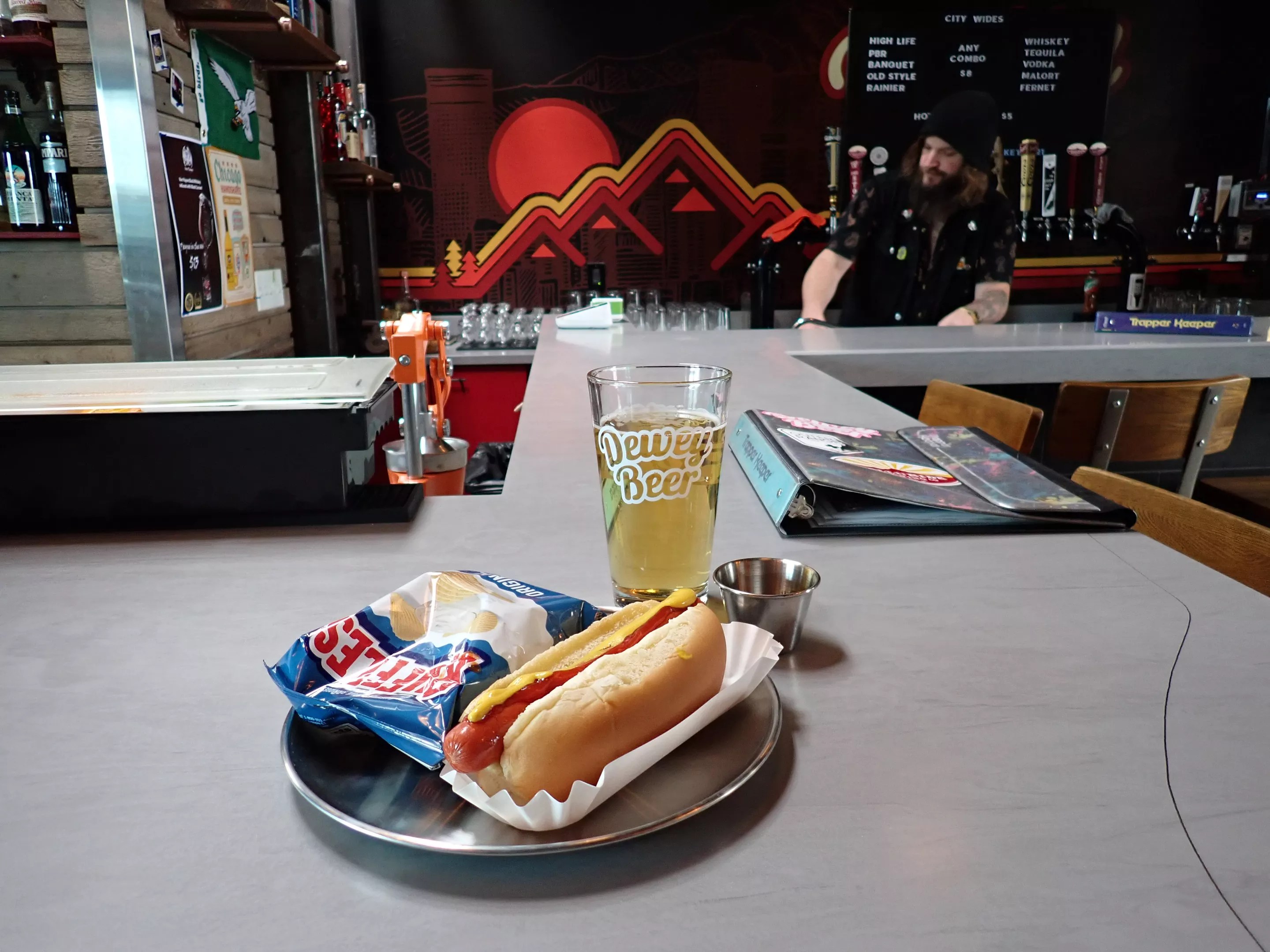 Our Mutual Friend Brewing has a simple proposition: Buy a beer Monday afternoon or evening, and get a free “basic AF” hot dog. The brewery crew puts out the rollers and starts cooking shortly after noon. The dogs are indeed basic, but the buns are soft, and ketchup, yellow mustard and sweet relish are available. This dog is the perfect complement to a cold beer, and could be the start of a new drinking trend: beer with a hot dog back.