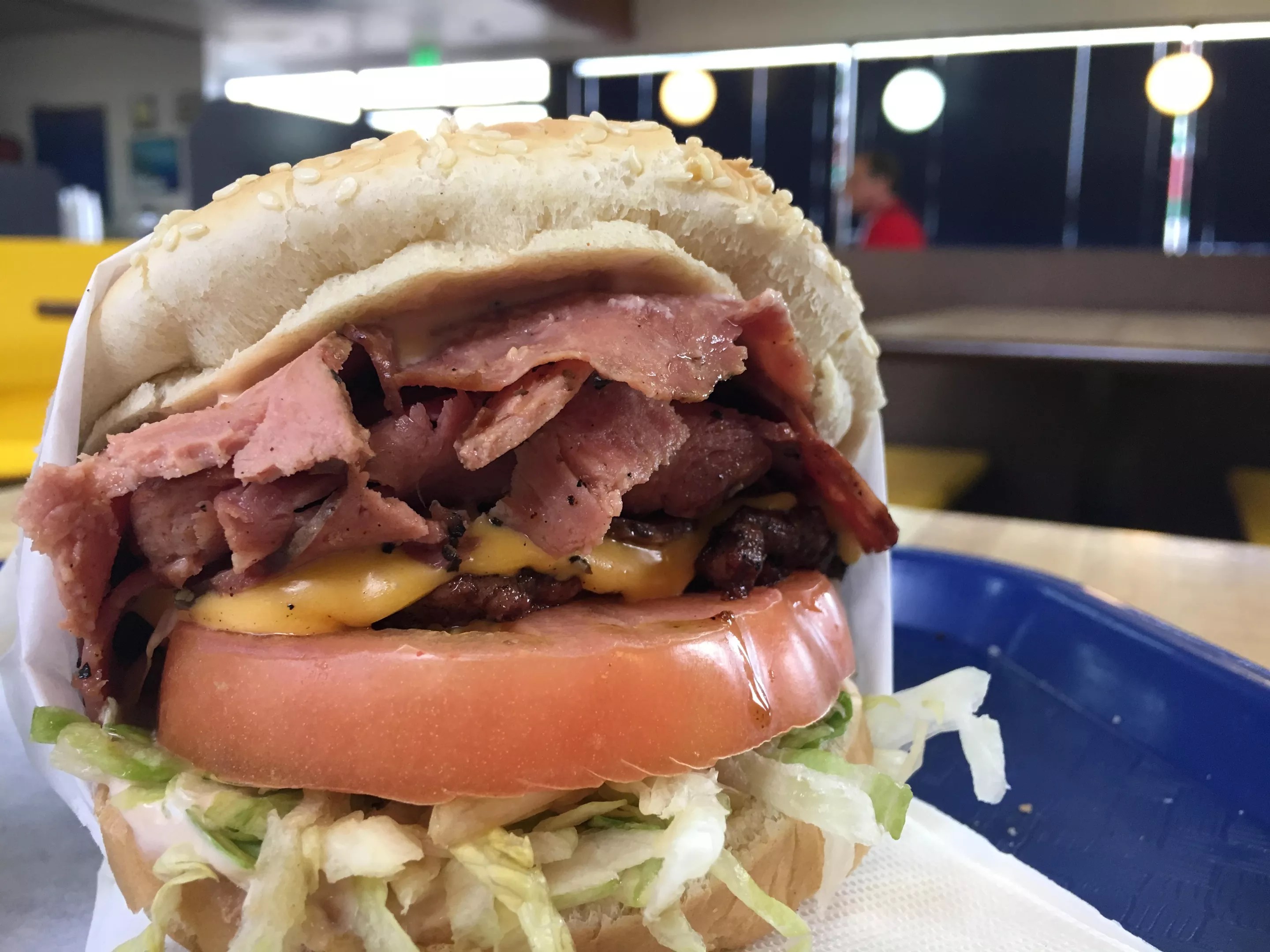 Yes, there’s a burger patty somewhere under all the pastrami on Crown Burger’s Royal.