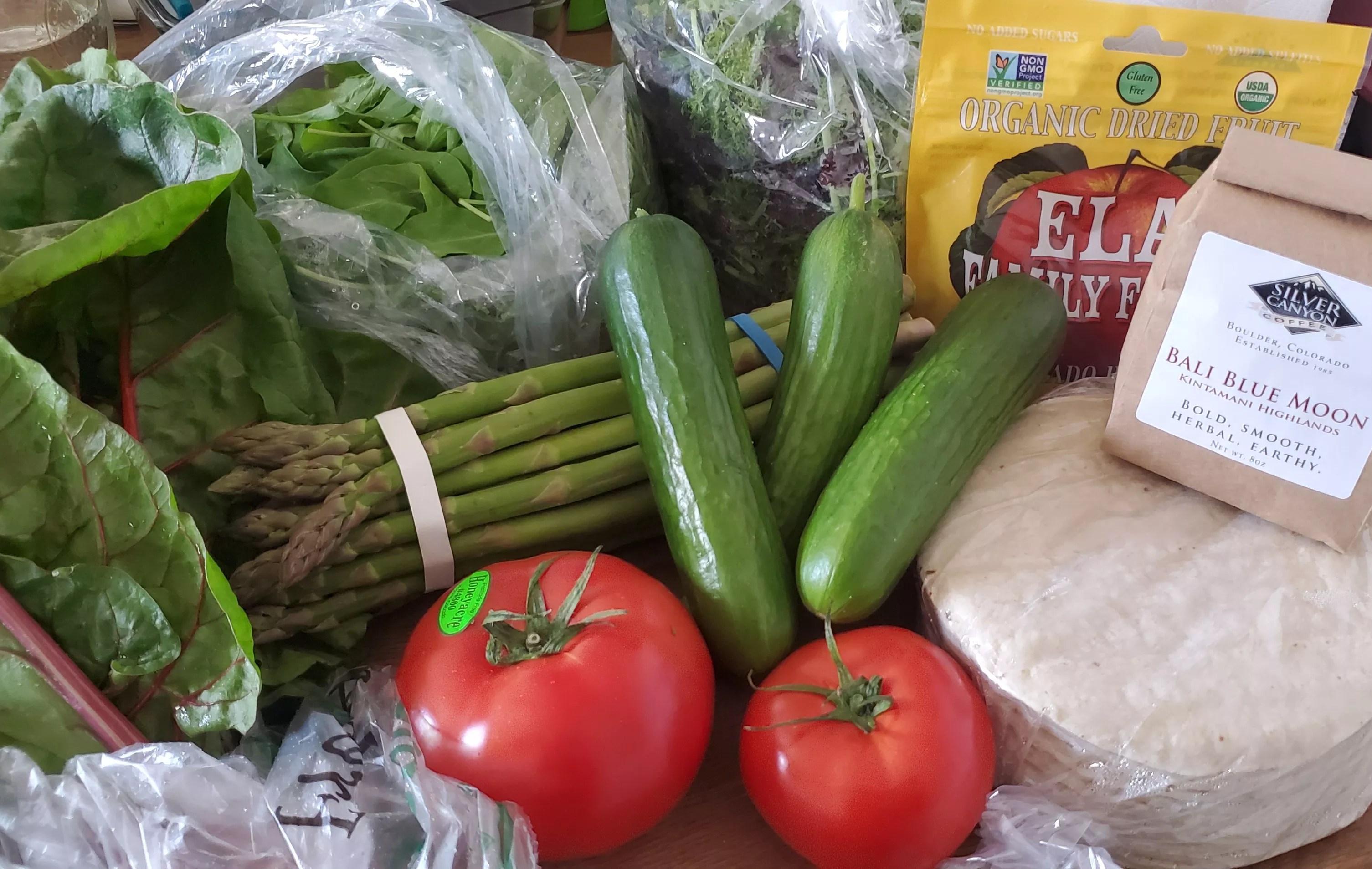 The items I had picked out online came neatly packed in a brown paper bag. While I couldn’t see what was inside, I had faith it was filled with cucumbers and tomatoes from Honeyacre Produce, Swiss chard from Croft Family Farms, arugula and spicy frills from Ollin Farms, asparagus from Kiowa Valley Organics, potatoes from Miller Farms, dried fruit from Ela Family Farms and tortillas from Tortilleria La Esmeralda. A haul of produce ordered through the Boulder County Farmers’ Market online platform. Linnea Covington