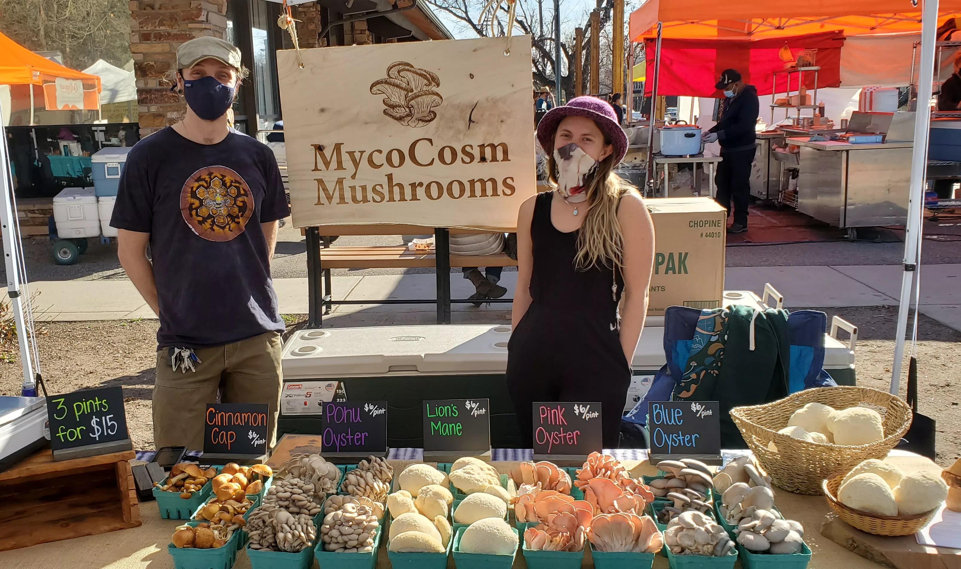 “We are super grateful to be here and to be the second mushroom farm this market has seen,” says Jess Leblanc, who worked the Saturday stand with Justin Killing, founder of MycoCosm. “We are also happy to be outside working with friendly people,” Killing adds.