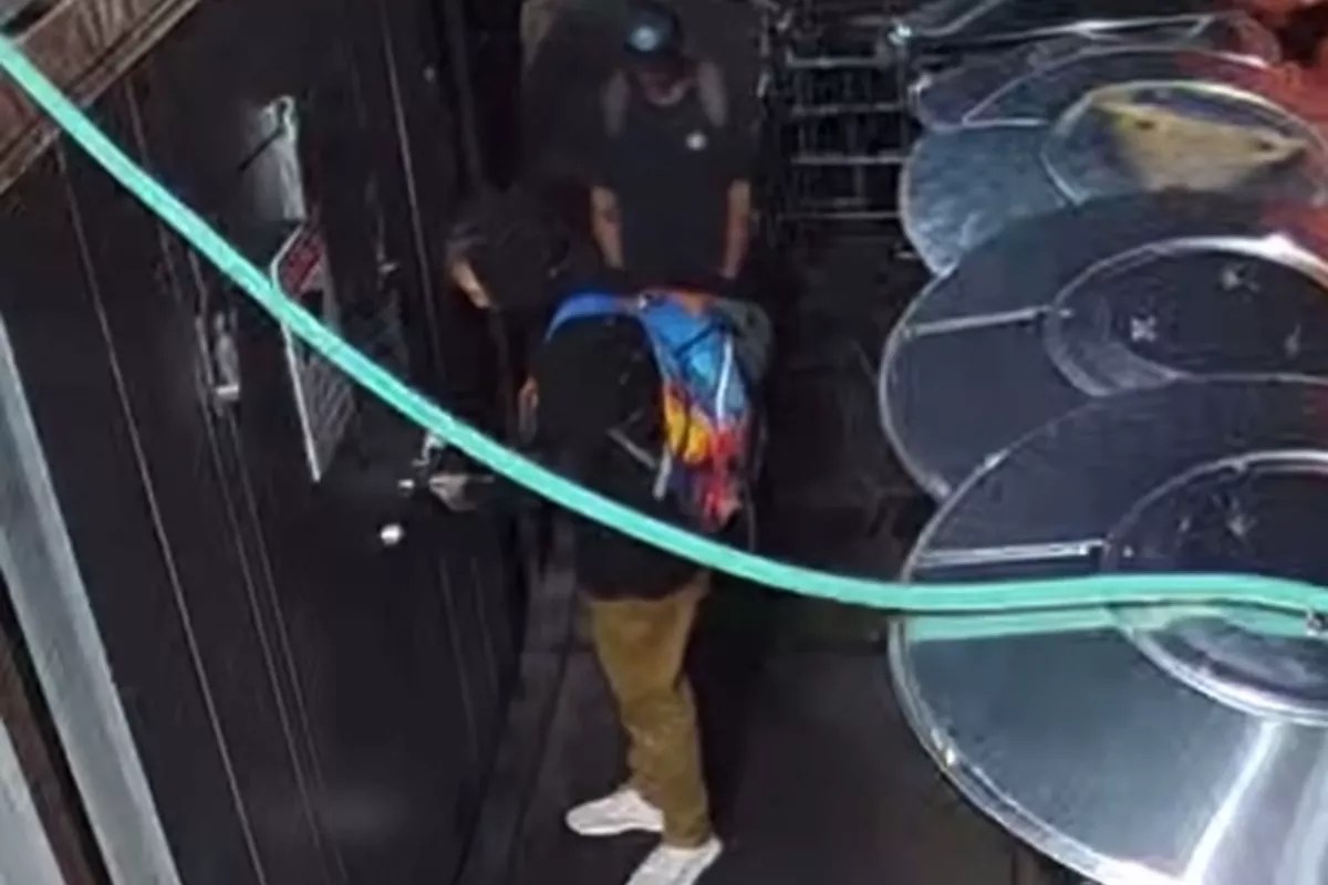The 22-second footage shows a man in a black hoodie, khakis, white sneakers and a tie-dye backpack fiddling with the handle of a walk-in freezer before opening the door. Meanwhile, two other men, both with backpacks, stand nearby, and a third man further behind paces back and forth like he’s keeping watch. No one has been arrested yet, according to Glover.