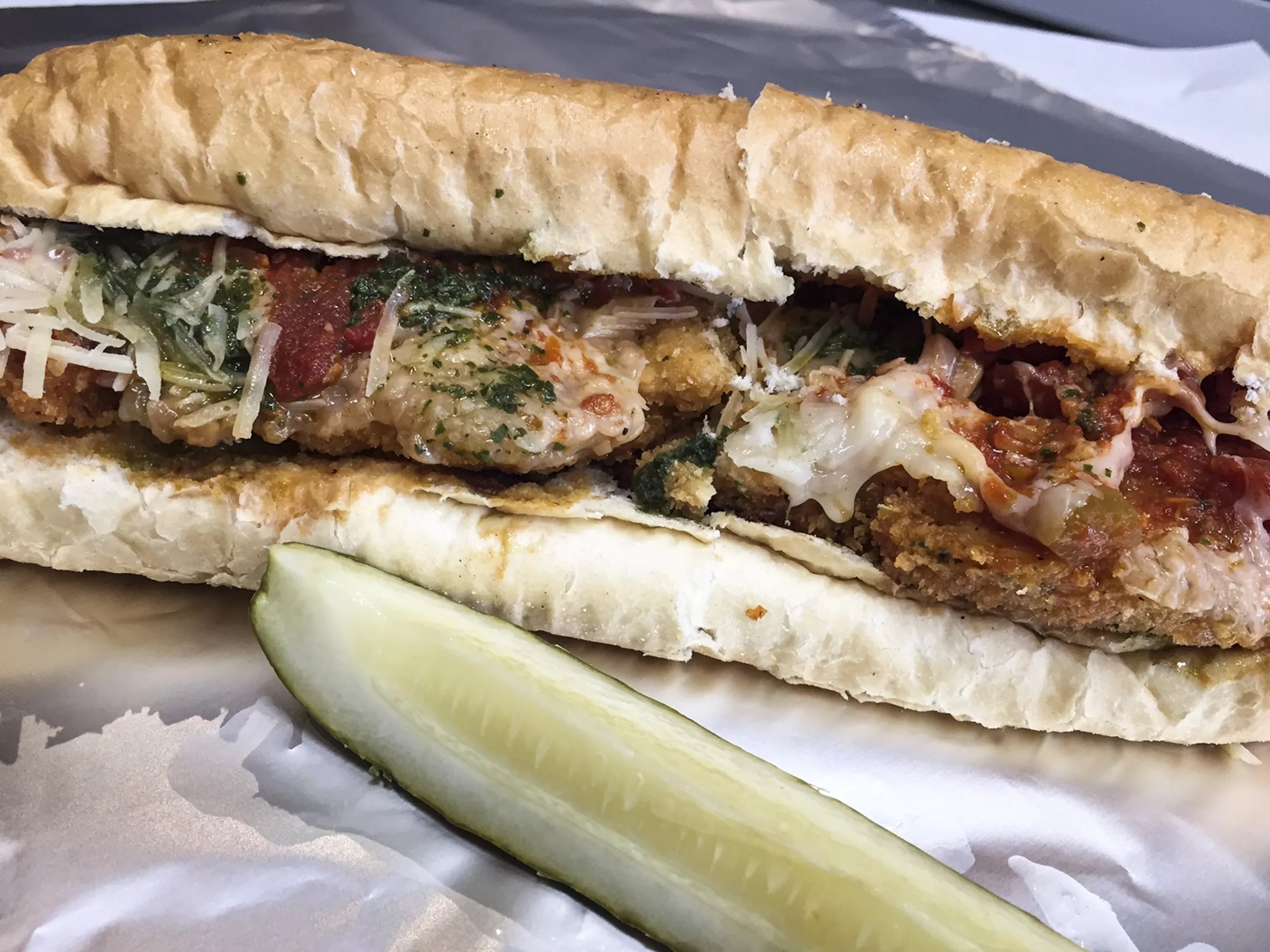 The chicken parmigiano sandwich at Broadway Deli, 8 South Broadway.