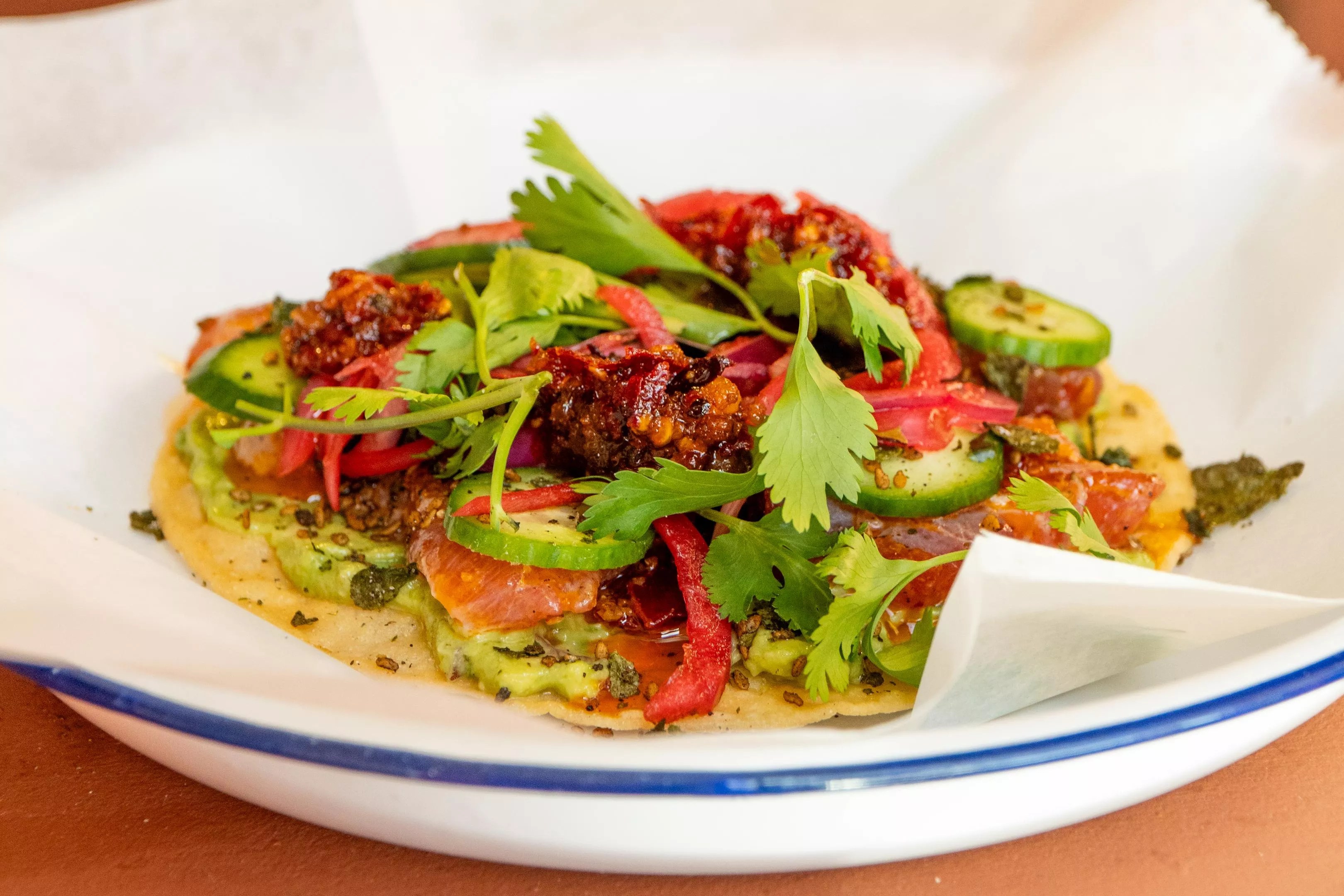 Choza’s tostada de atun: ahi tuna served with salsa macha, avocado, cucumber, red onions and toasted nori.