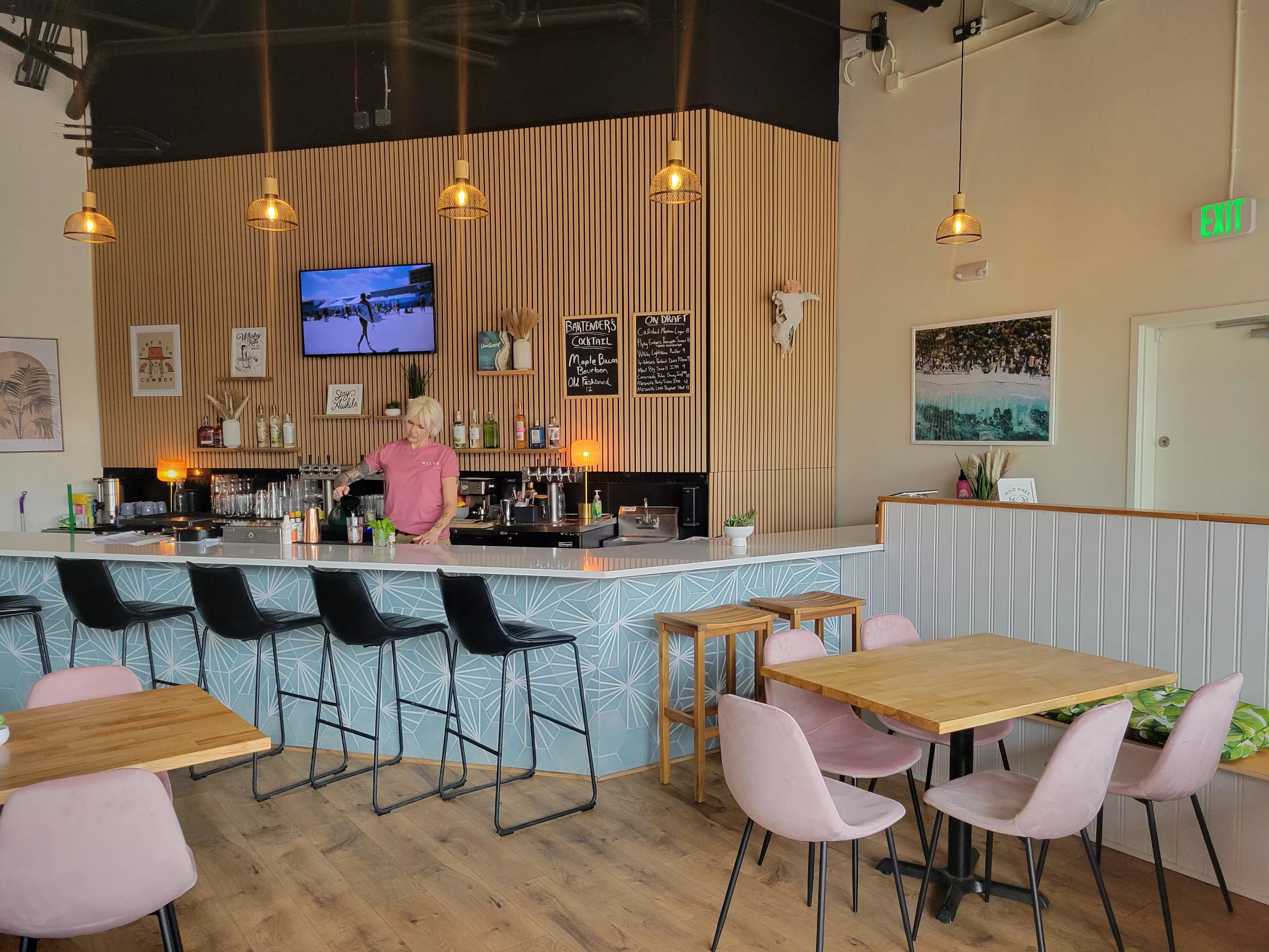 What we saw: It’s clear that Lydie Lovett’s Wilde will become an Instagram-selfie haven — the gorgeous blue and pink sunrise wall sees to that. The rest of the space is just as bright, with a California surfer vibe mixed with boho chic. On a recent visit, there was even a woman’s surfing show playing on the lone television set, serving as the perfect background for indulging in a blood orange champagne cocktail and a plate of Baja fish tacos.