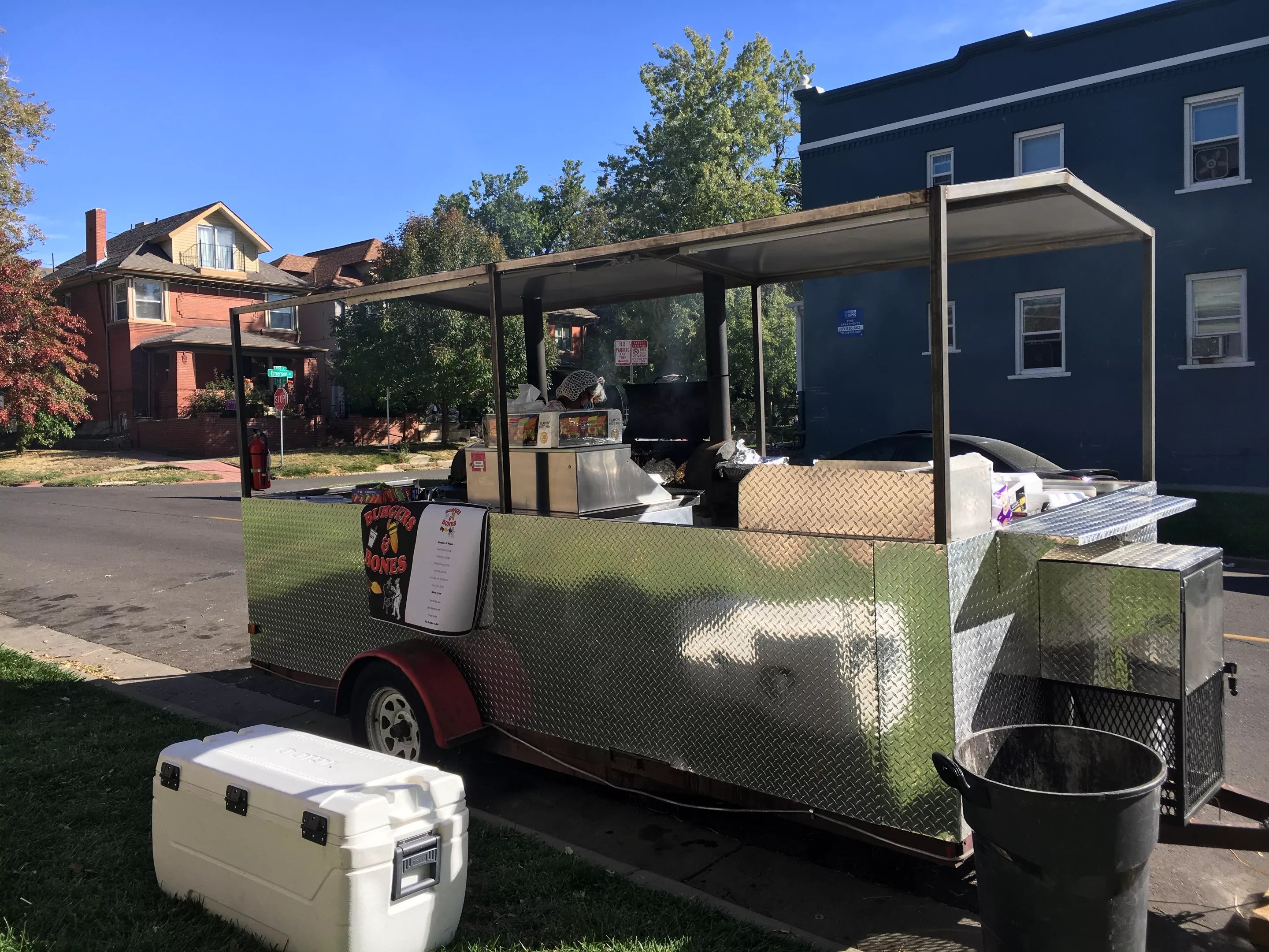 The enticing smell of wood smoke alerted me to the proximity of barbecuing meats about a half-block before I spotted the open-sided trailer at the corner of East 23rd Avenue and Emerson Street. A thin plume of smoke rose from a stovepipe chimney attached to a barrel smoker on the trailer. This was what I was looking for: a mobile barbecue kitchen called Burgers & Bones that a friend had alerted me to.