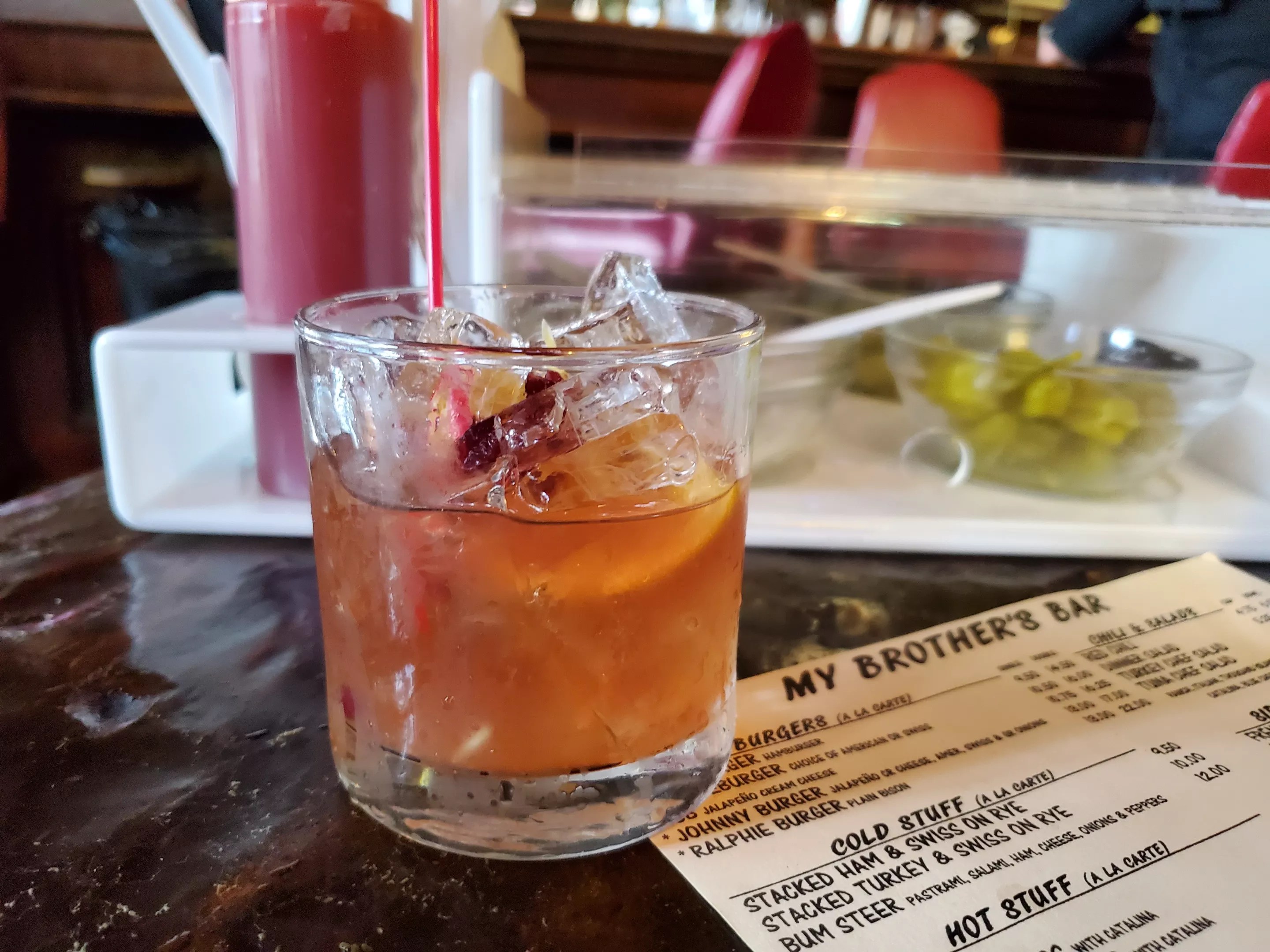 An Old Fashioned with a cherry garnish at My Brother’s Bar.
