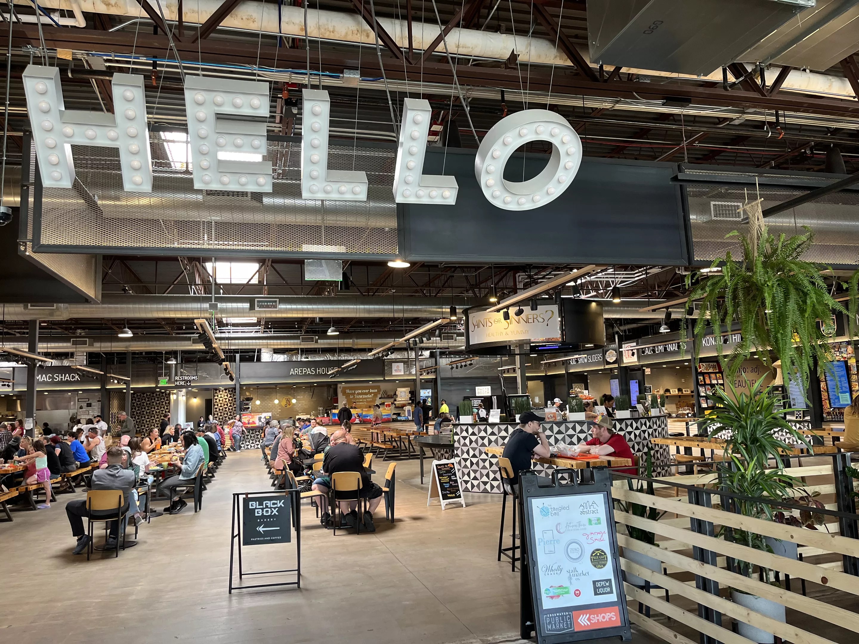 The food hall is more of a destination than a neighborhood place, and it’s just a ten-minute walk from the bus stop. The selection is super varied, with tacos, sushi, ramen, a brewery and a full bar, Ethiopian fare, a juice station, pizza, crepes, mac and cheese bowls and more.