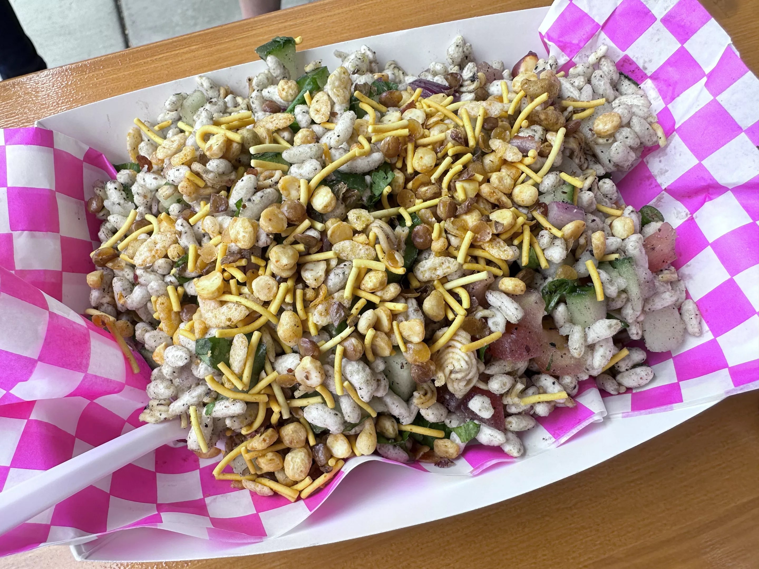 After nearly two years of planning and building, the couple officially launched Cafe Jhapa in July. At the heart of its menu is the beloved Nepali street chapate. “It has puffed rice and all kind of veggies, potato, cucumber, onions, tomatoes, Thai chile, cilantro, mustard seed and a little oil,” Gurung explains. “Then it’s topped with a crunchy spicy mix of dry ramen, and then the main thing is lemon juice.” With a little bit of spice and a crunchy texture, it’s no wonder this dish is one of the most popular street foods in Nepal.