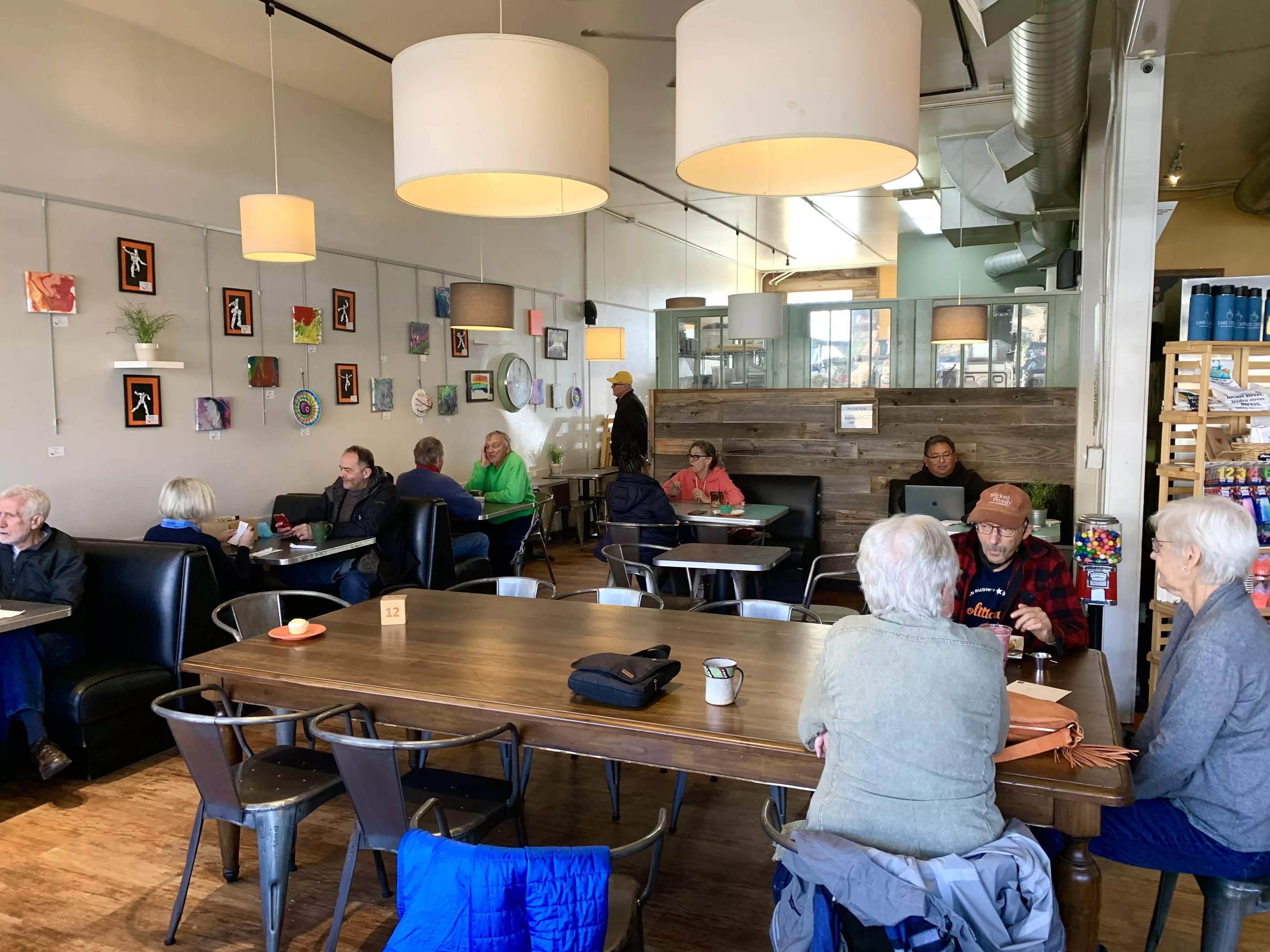 Locals often gather for coffee and conversations in the dining room at Cake Crumbs.