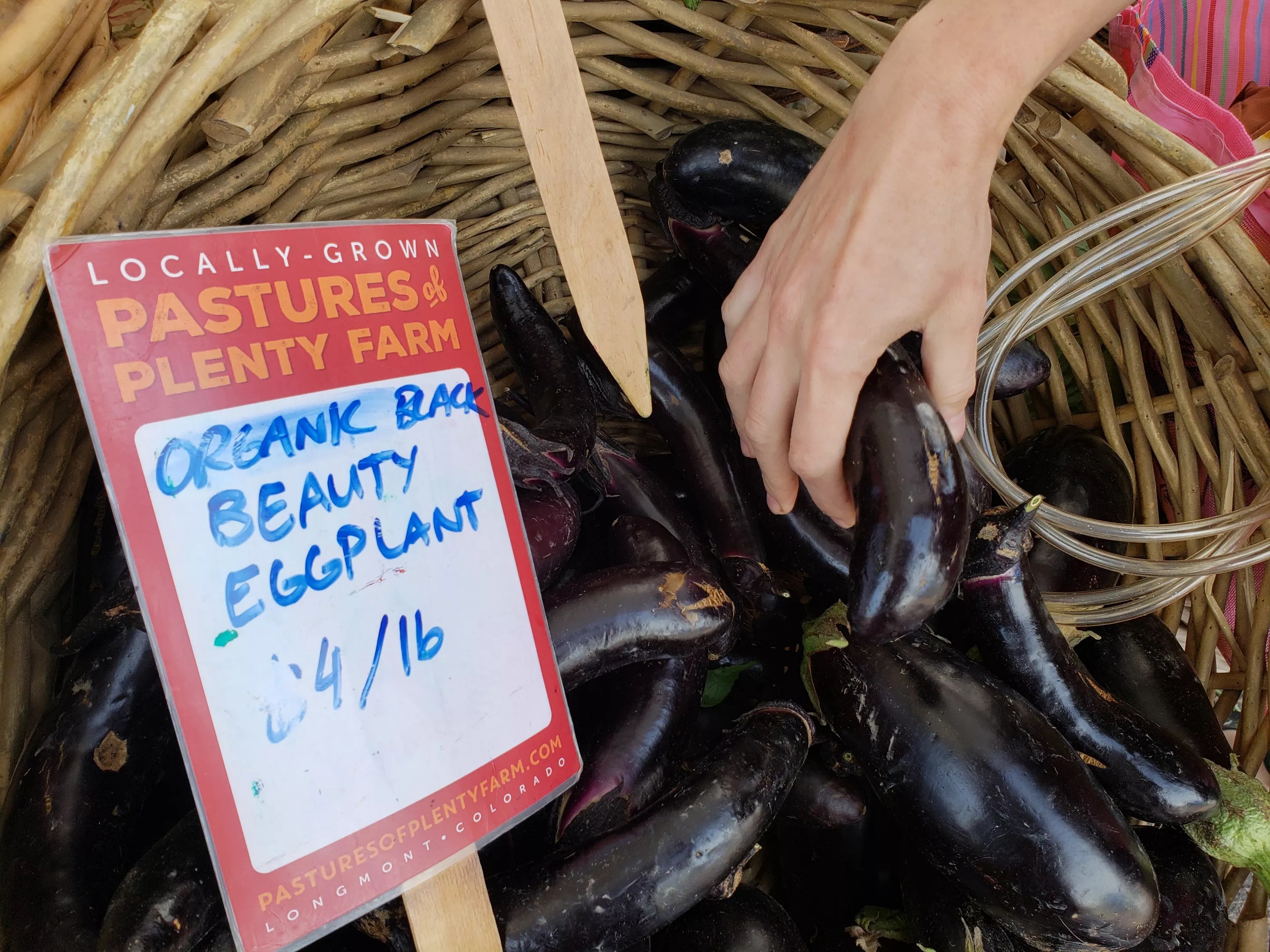 On this particular day the chef had plenty to pick up, and she started with a brilliant bunch of flowers from Pastures of Plenty Farm out of Longmont. The blossoms would help deck out her sunny spot, and the head of cabbage she reached for as she handed the bouquet to be wrapped would make a delicious sauerkraut. Before she paid, Glover had also added a bunch of Sierra Bianca onions and handful of deep-purple Japanese eggplants that she assigned to be preserved with garlic, chili flakes and vinegar.