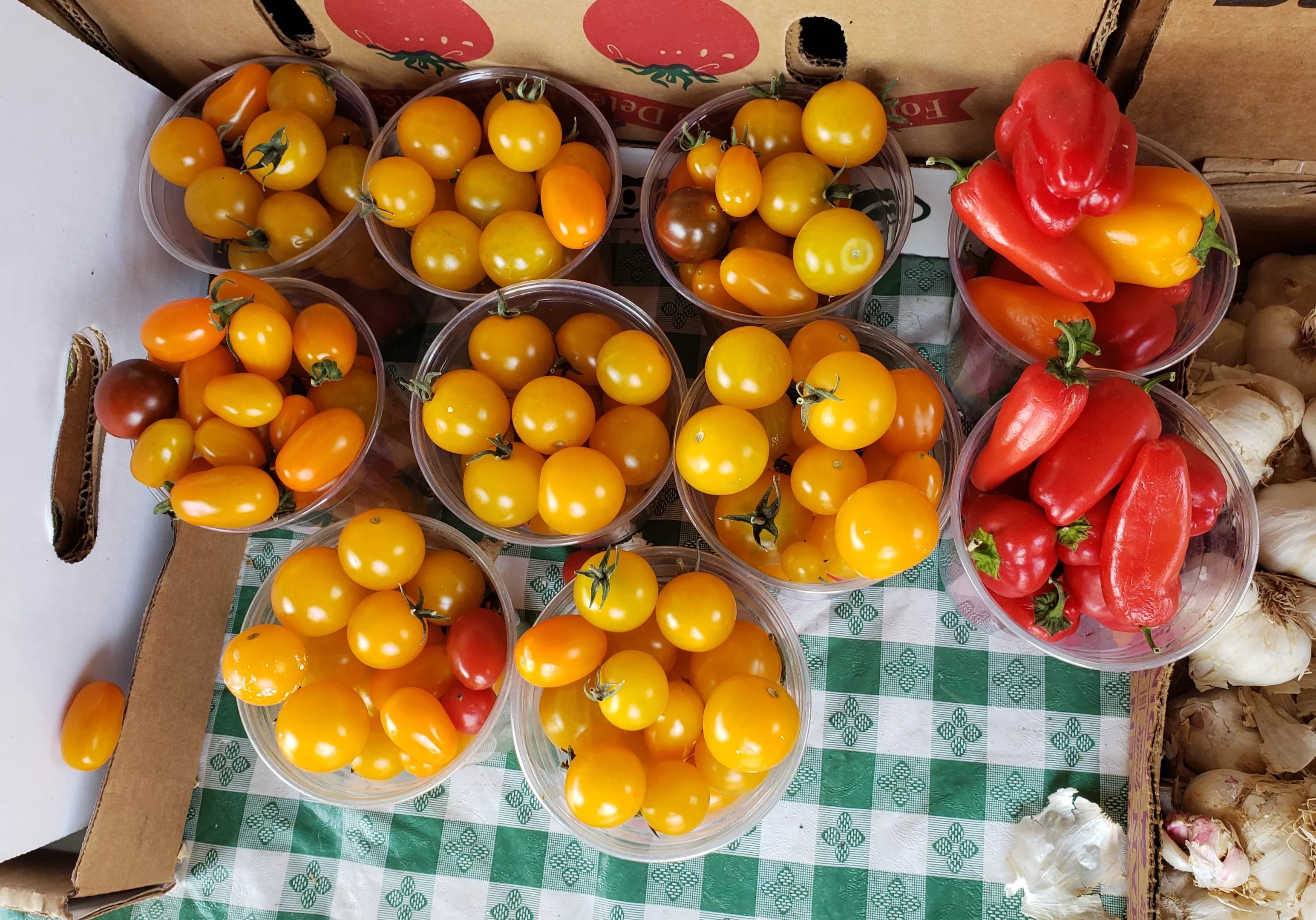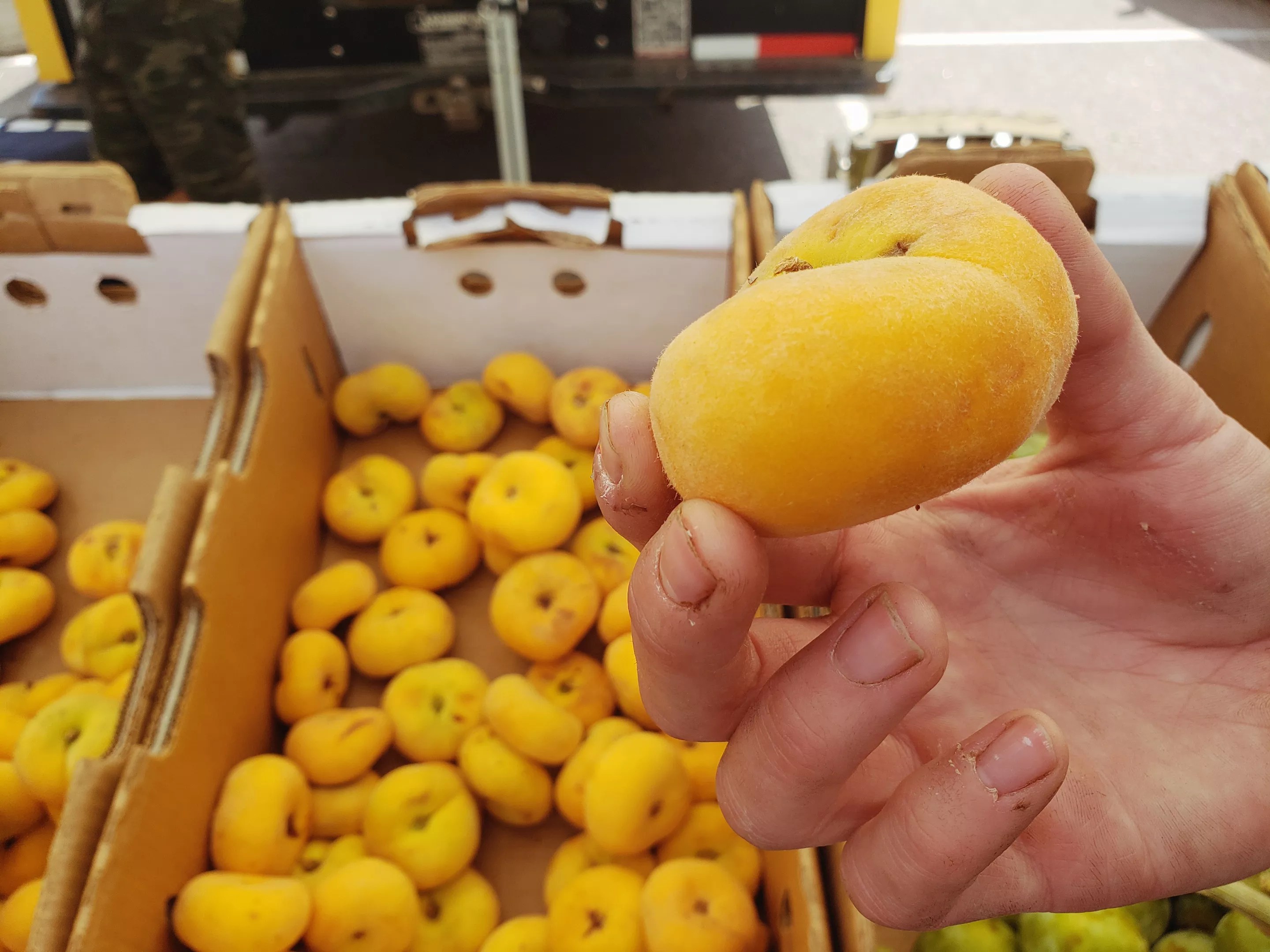 Tuesday is the first day of the week for Annette, so Wednesdays tend to be a big shopping day for the chef, and although she had full bags and a sore back, she still had stuff to buy. Across from Palizzi Farms’ stand rested Eat a Peach Farms from Palisade. Here the chef found cups full of bright heirloom yellow cherry tomatoes, which she stocked up on. Then we visited Forté Fruits, also located in Palisade. Peter Forte has had the farm since 1972 and has gone through 45 harvests. Right now that harvest showcases mango-doughnut peaches, pluots (a cross between an apricot and a plum), peaches, nectarines and some apples. The farm also grows tomatoes, and at just $2 a pound for just about everything, it’s not the price tag most people think of when they talk about shopping at the farmers’ market. Cups full of heirloom cherry tomatoes from Eat a Peach Farms. Linnea Covington