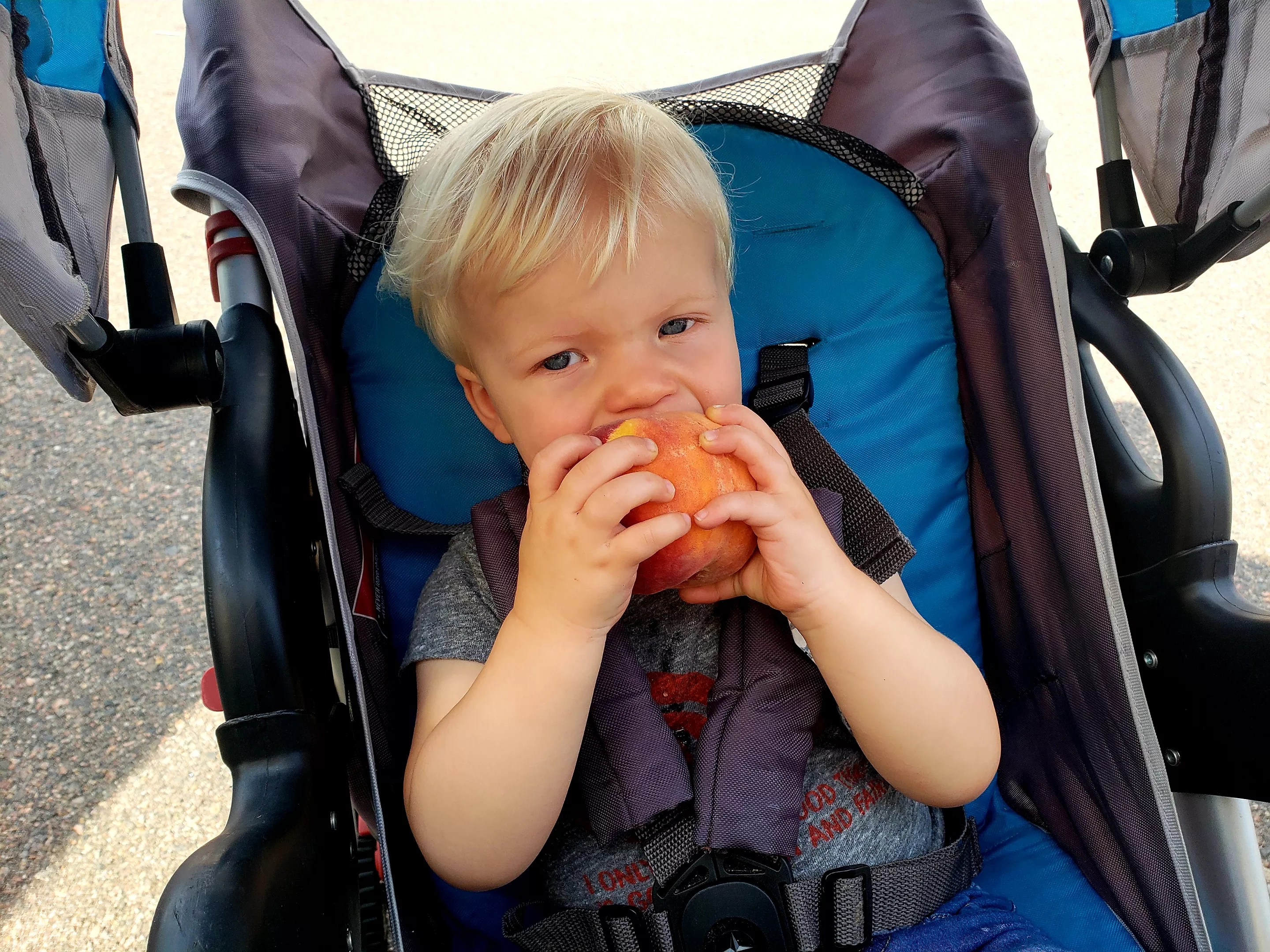Chef Caroline Glover sniffs stone fruit at the Cherry Creek Farmers’ Market.