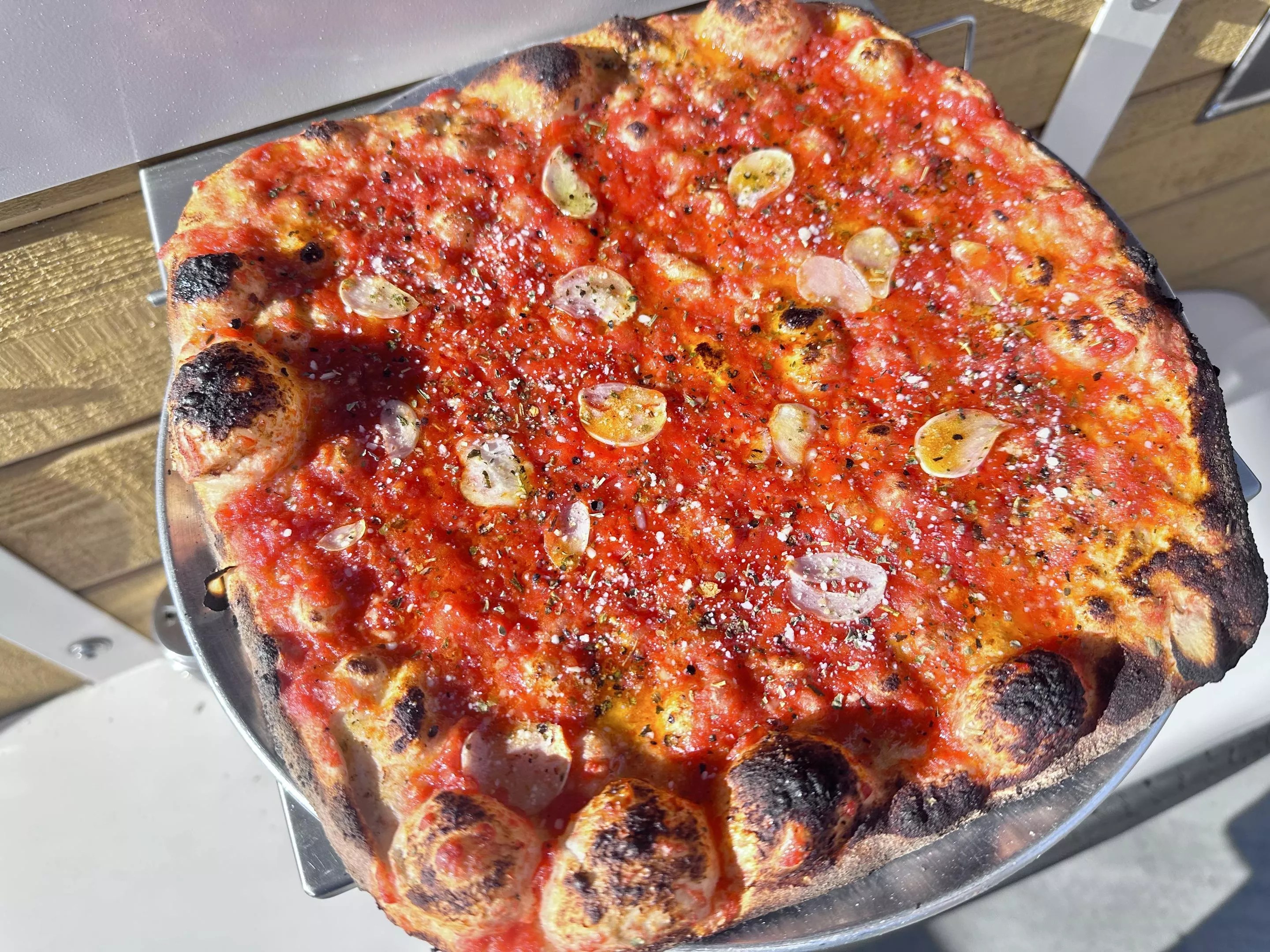 While honing his pizza style, “I did a lot of homework, researching online and calling old friends in Jersey,” Rogel explains. “I found out what all the old-school New York pizza joints use — what kind of flour they use, what kind of tomatoes they use, what kind of cheese they use. I just wanted to keep it authentic. … I landed on old-school, Bari Italian-style pizza mixed with a little Jersey. It’s a very quick cook, very charred up, and a very thin style of pizza.”
