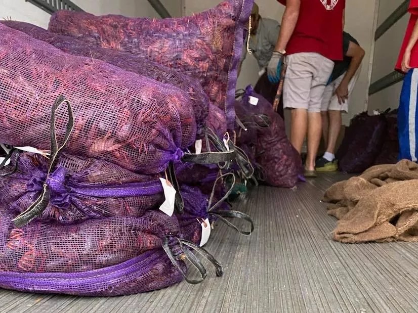 The live crustaceans are packed in mesh bags and can only be stacked three bags high before the weight begins to crush the ones on the bottom. So a big truck with built-in shelves is needed to spread out the load. “Buying thousands of pounds of crawfish is nerve-racking,” the chef notes. “Here’s the kicker: You need a refrigerated truck. You have to transport them at between 38 and no more than 43 degrees, which puts them in hibernation, but isn’t cold enough to freeze them.”