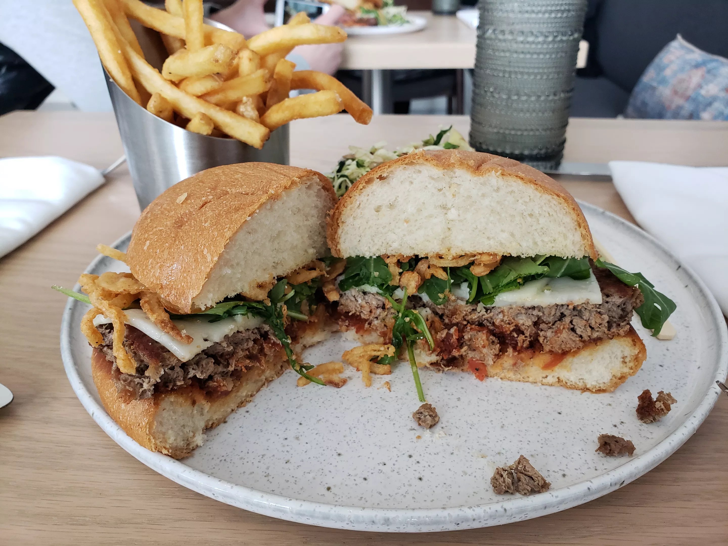 When the burgers arrived at our table, the pair look almost identical, though the Impossible patty was a little thinner. When we cut them open, one burger was definitely cooked medium-rare and the other well-done. Our server let us know the real beef was the pinker of the two.
