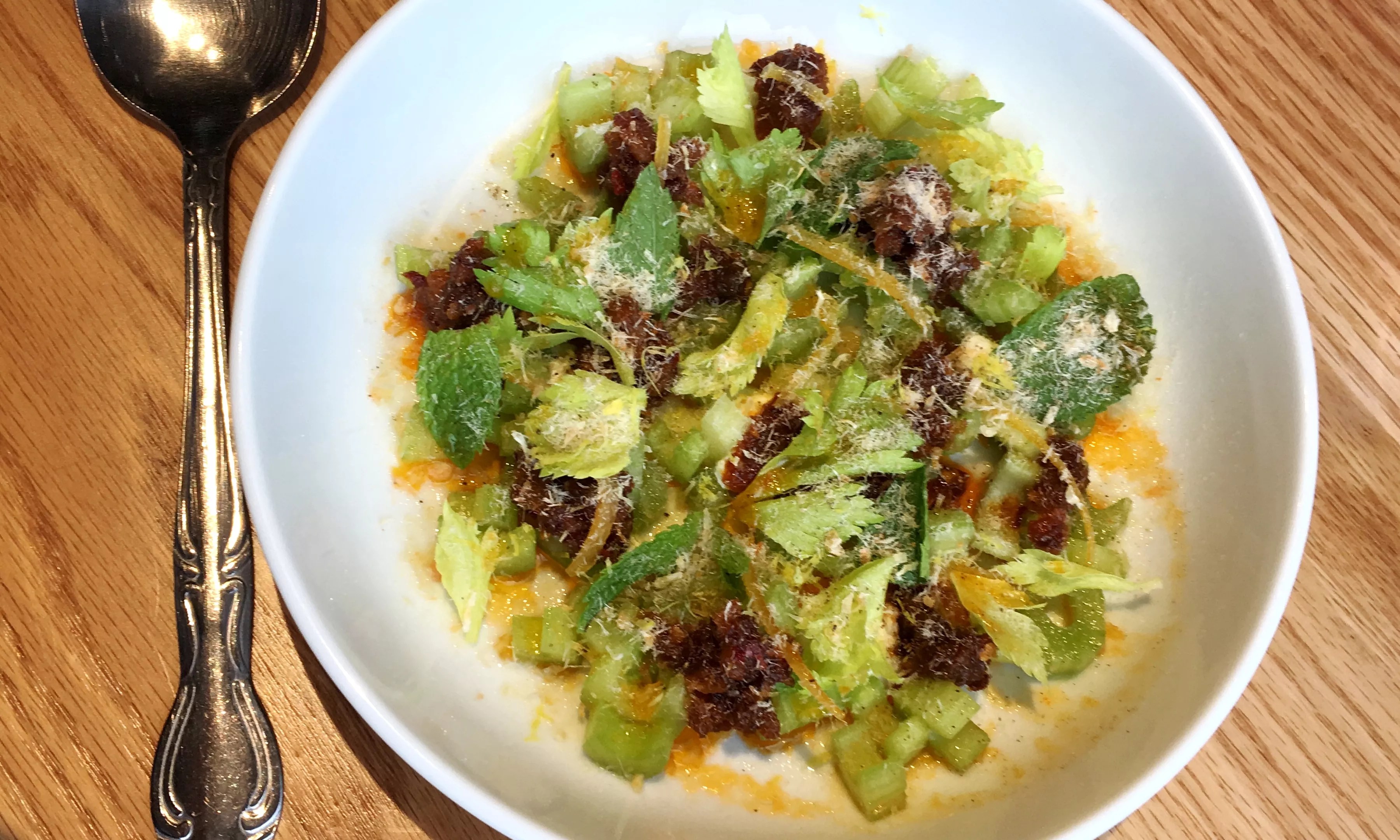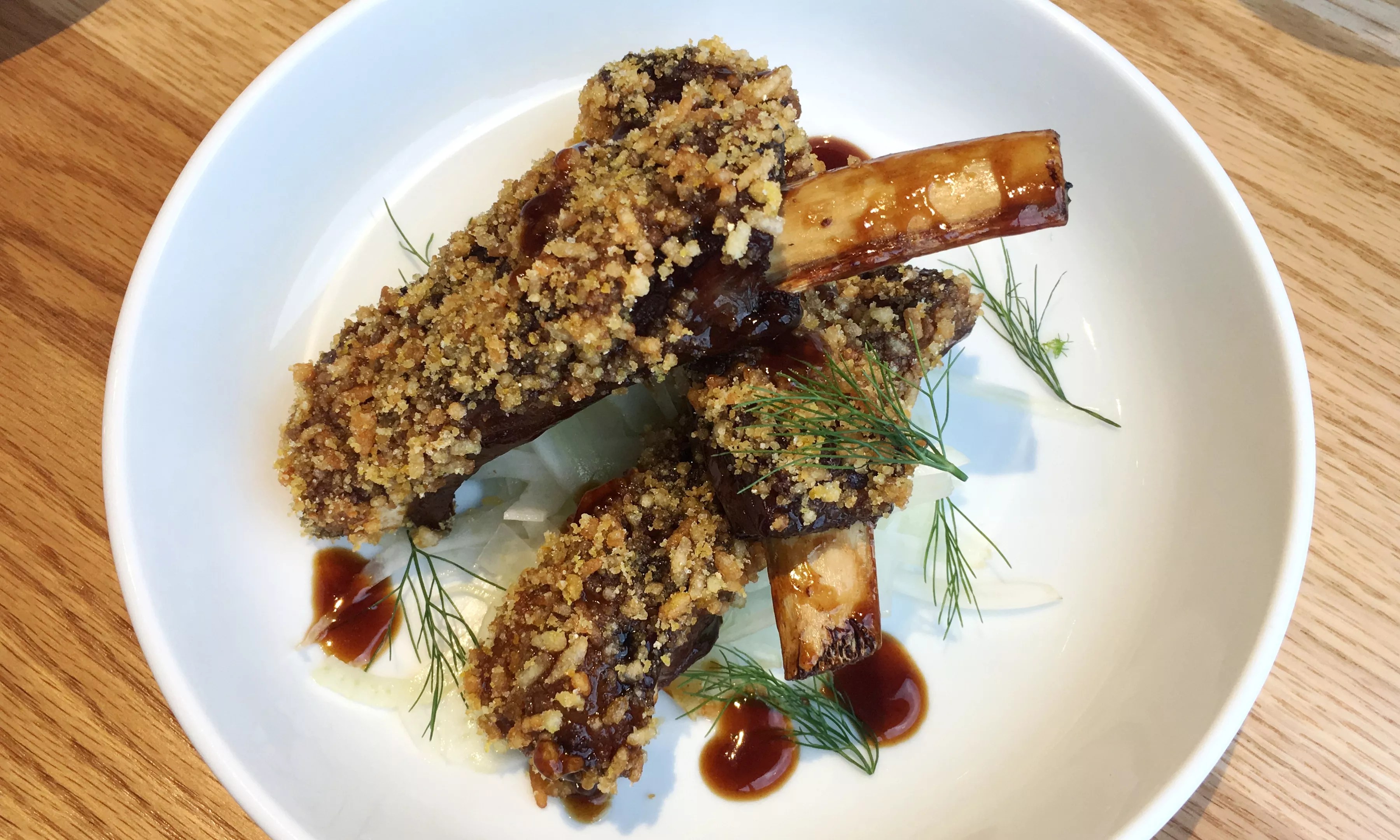 But a new cult favorite could emerge among the noodle soups, curries, buns and other dishes inspired by the cuisines of Japan, China and Thailand: Southern-fried mushrooms. The appetizer doesn’t draw attention with exotic-sounding ingredients, and at first glance the menu description could read as little more than standard barroom fried ‘shrooms. But these are made with maitake – or hen of the woods – mushrooms, giving them a meaty texture that pulls apart almost like pork or chicken. XO celery salad with sour cream, preserved lemon and mint. The flavor profile is reminiscent of Buffalo wings. Mark Antonation Ginger-soy braised lamb ribs with fennel, orange and crispy rice. Mark Antonation