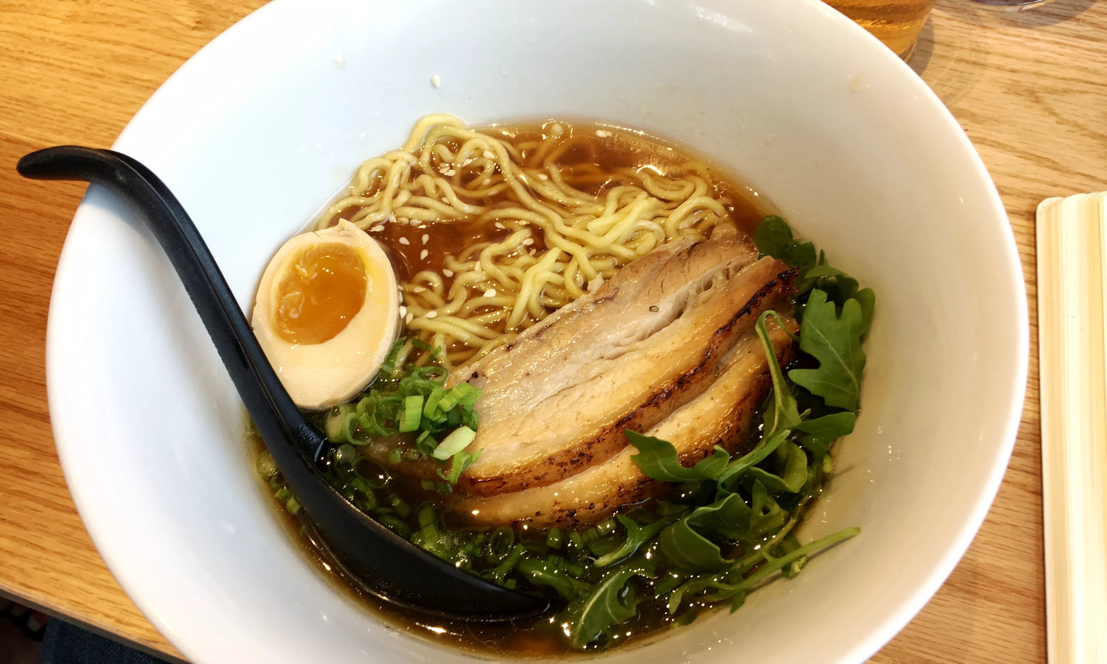 The new Tokyo shoyu ramen comes with pork belly and a traditional marinated ajitama egg.