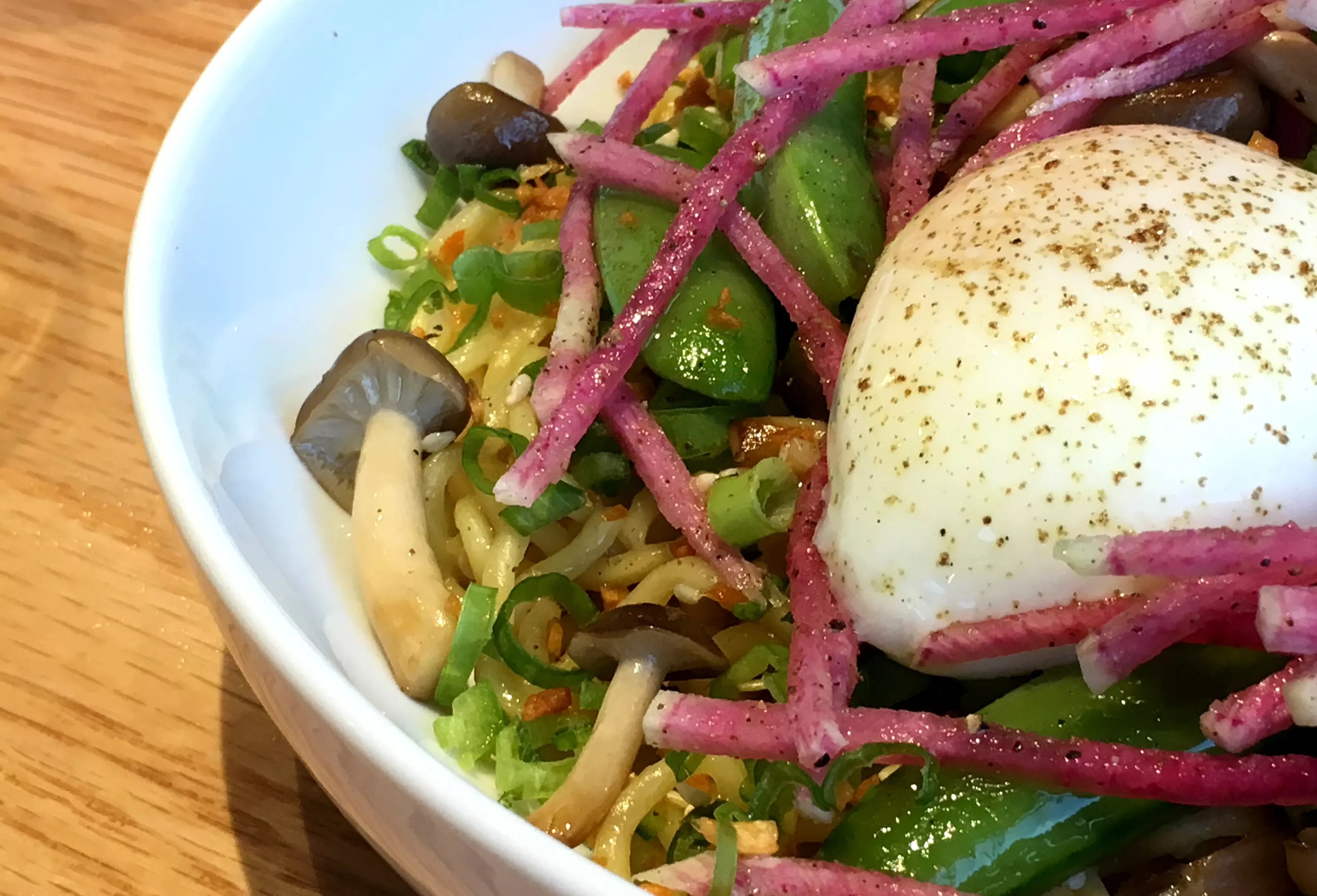 A new veggie mazemen ramen with buna-shimeji mushrooms, snap peas, crispy garlic, serrano and watermelon radish.