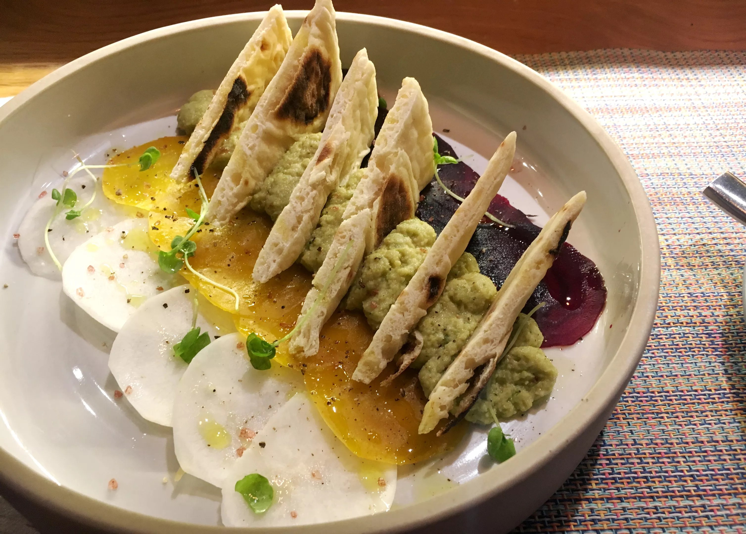 Other new items on Prout’s menu include a delicate salad of pickled apples with Hook’s Extra Inning cheese, a Wisconsin product made with goat, sheep and cow milk. Along with cashews and mustard seeds, the salad evokes a refined version of a picnic side dish. A summer risotto comes loaded with green beans, heirloom tomatoes and garlic crema, encircled by a sunny mango-chardonnay coulis. And a plate of green chile hummus gets added crunch from layers of thin-shaved Tokyo turnips and vivid baby beets.