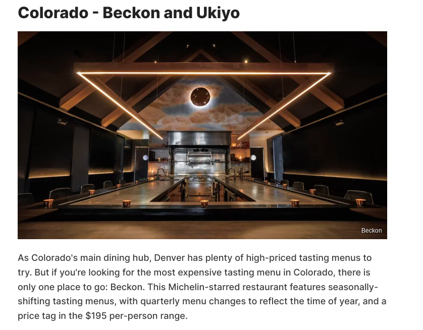 At $195 per person, Beckon isn’t even the most expensive option among Colorado’s current six Michelin-starred restaurants. And Ukiyo, which does not have a star, is $175. Oddly, Chowhound also misses the mark in its description, which says nothing about Ukiyo and only focuses on Beckon.