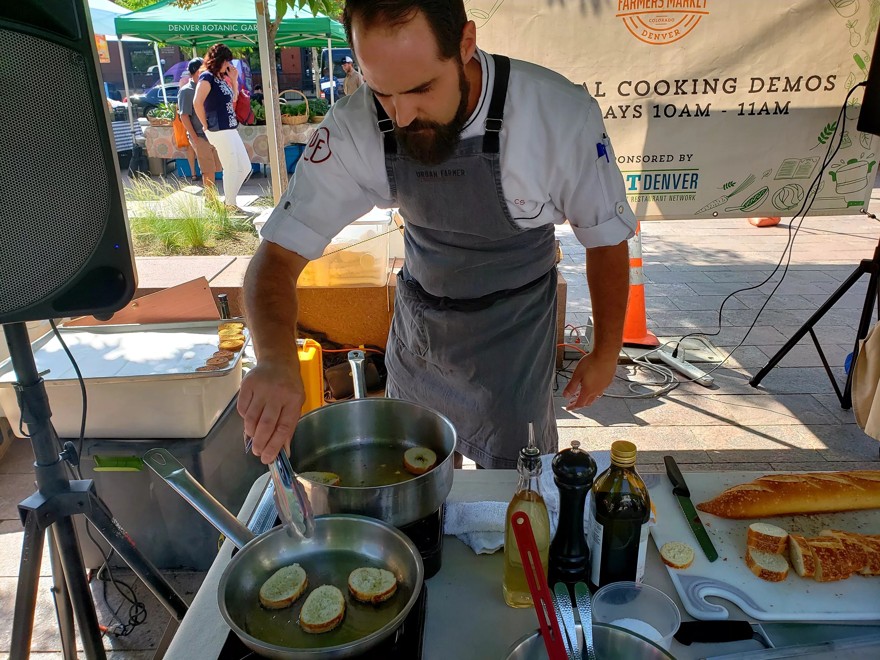 Chef Chris Starkus toasts baguette rounds at the Union Station Farmers’ Market.