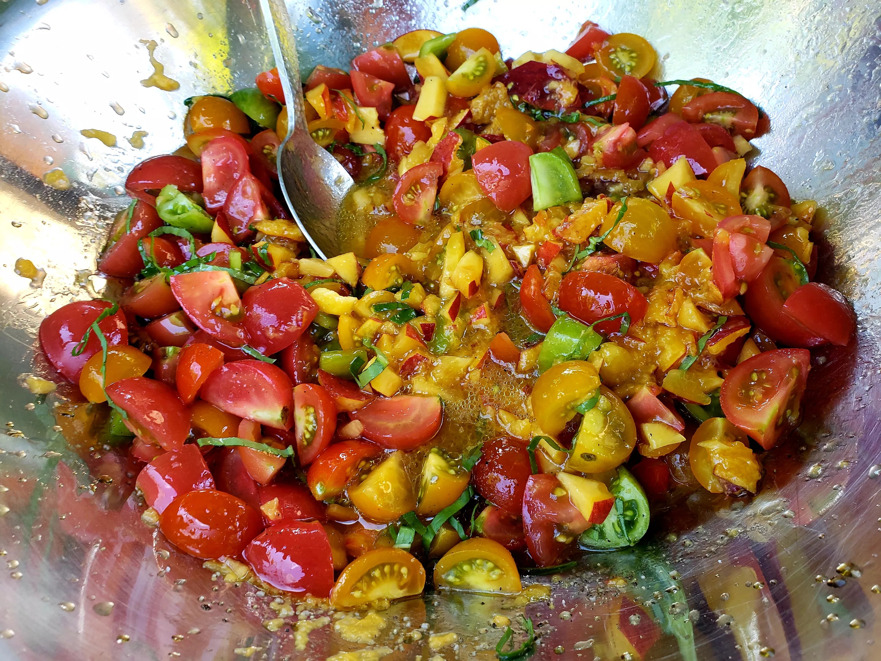 The glorious “salad” of heirloom tomatoes, honey, peaches and basil, all from the Union Station Farmers’ Market on June 30.