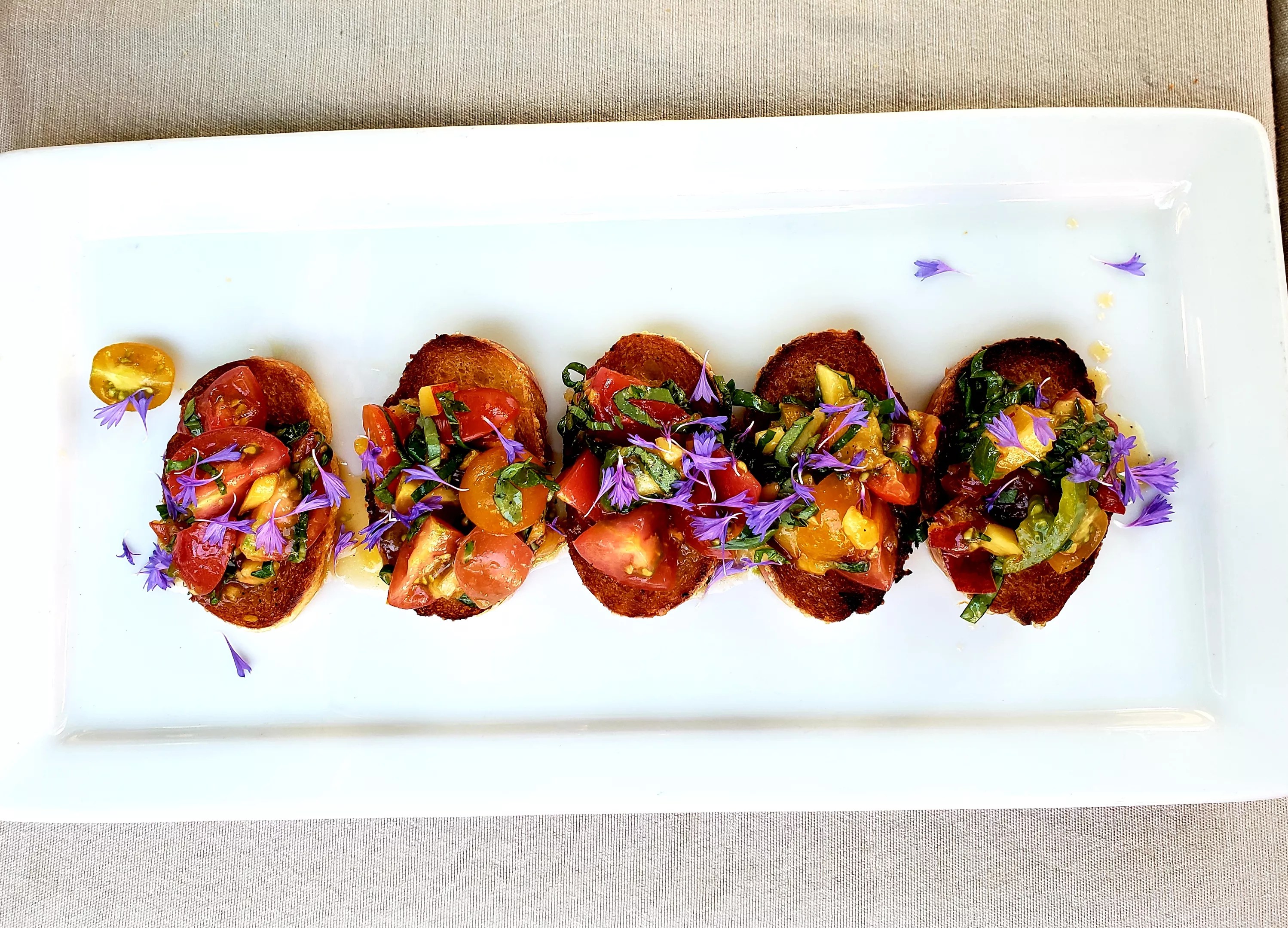 As he worked prepping the produce, a small crowd began to form, both to watch him prep and to get a closer look at the bees. The marriage of food, farms and beekeeping remained ever-prevalent during the demonstration, and Starkus was proud to highlight the growers he used at Urban Farmer. Corner Post Meats, he says, provides pork for the kitchen. Rocky Mountain Fresh does all the tomatoes – more cheaply, he adds, than out-of-state growers. Soon, he says, he is about to start using Morton’s Orchards for peaches to replace blueberries on the seasonal menu. Josh Olsen from ACRES is a friend, and there are talks about him becoming Starkus’s apprentice beekeeper. The bruschetta chef Chris Starkus made for the chef’s demo at the Union Station Farmers’ Market on June 30. Linnea Covington