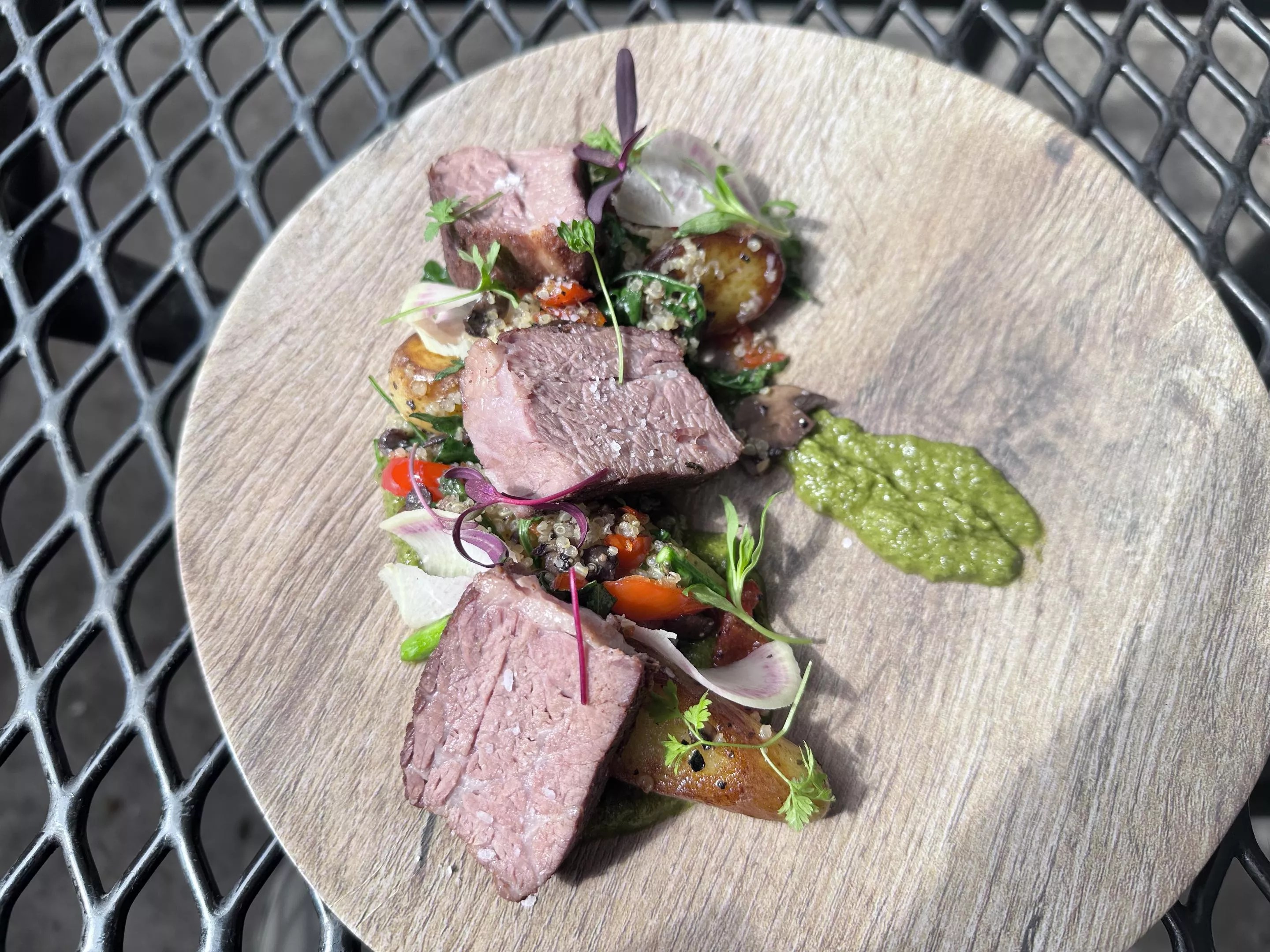 The steak bowl includes braised short rib, roasted potatoes, quinoa, asparagus, carrot, peppadews, arugula, mushroom and chimichurri.