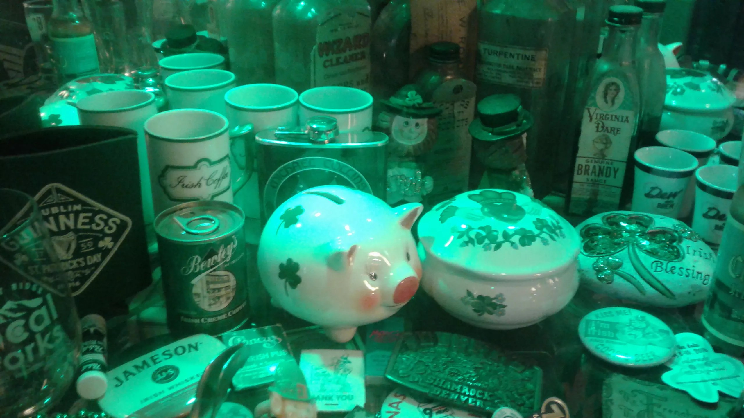 What my friend and I dubbed a “Grandma cabinet” full of trinkets, lit by a green light, just like in Ireland.