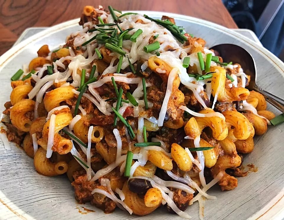 Any time there is a daily special, Chef Grimmond also makes a vegan option, like this chili mac, made with Impossible chili, cavatappi pasta and Daiya shredded cheese.