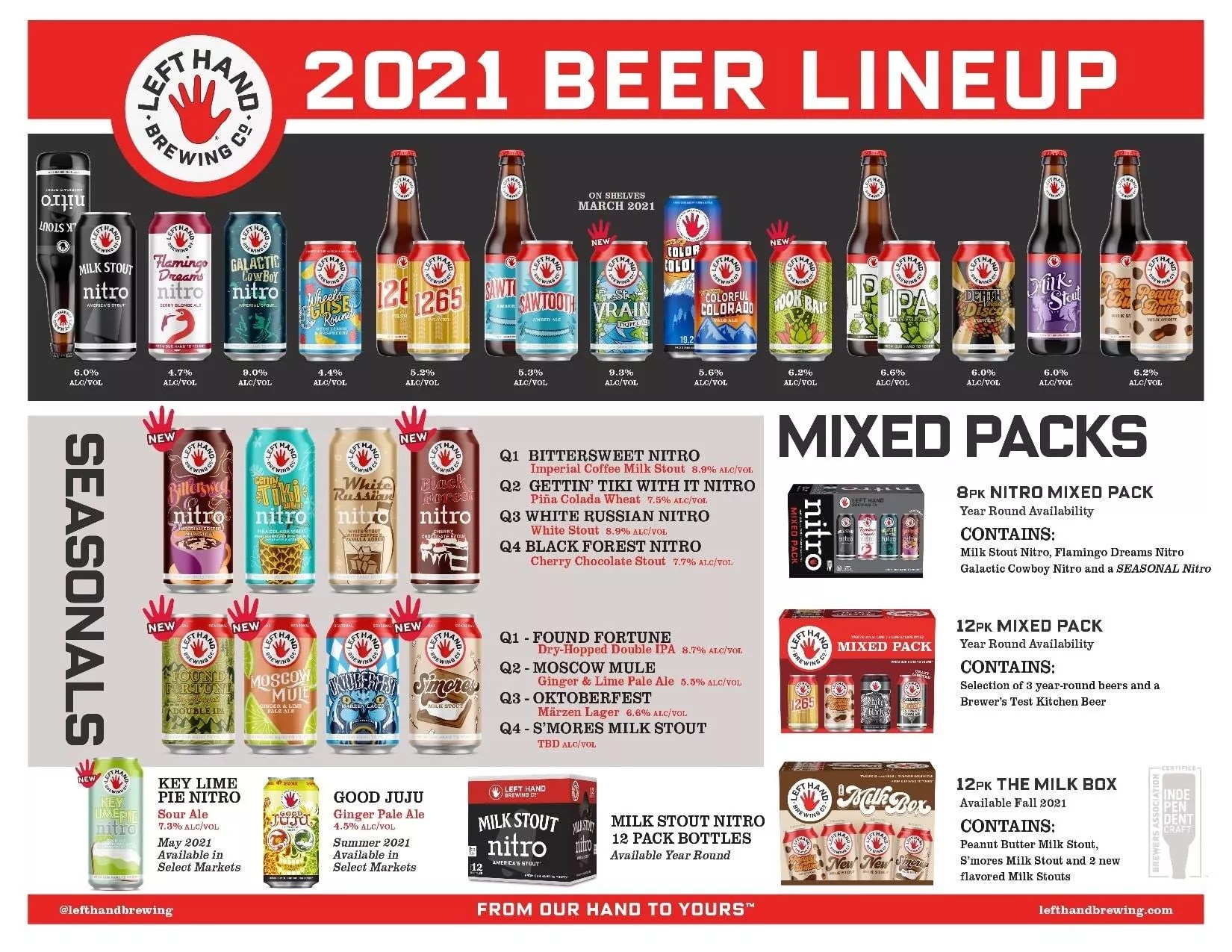 In addition to Found Fortune (above), Left Hand plans to drop ten or eleven other new beers in 2021, including Wook Bait IPA, Moscow Mule Pale Ale, Dry-Hopped Pineapple Ginger Sour, S’mores Milk Stout and two new Nitro beers: Key Lime Pie Nitro, a tart ale with lime, vanilla, cinnamon and lactose (coming in the spring), and Black Forest Nitro, a cherry chocolate stout (coming next winter).