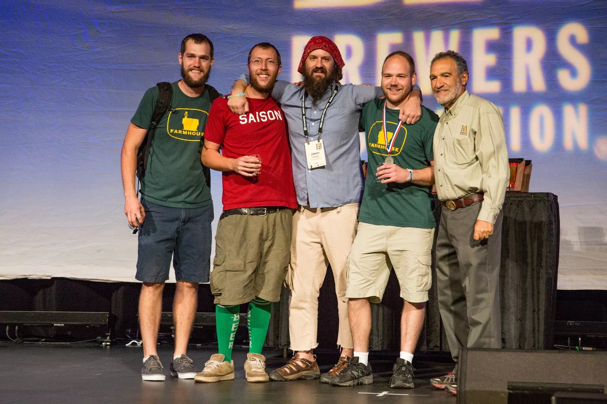 Jason Yester, center, on stage after winning a medal for Red Swingline at GABF.
