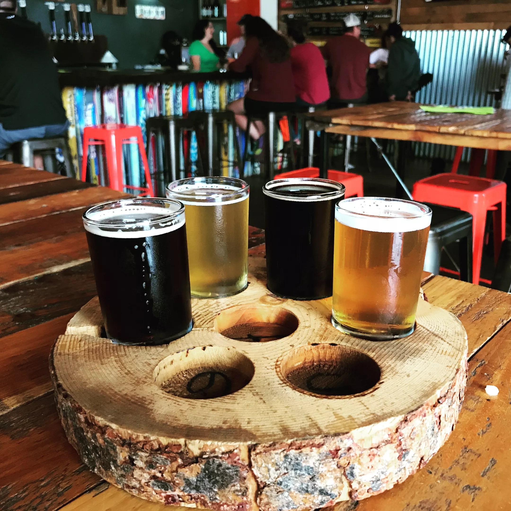Fate Brewing also has custom taster trays that use the brewery’s logo – four arrows pointing inward – as holes for the glasses. The whole thing looks like a pizza peel.