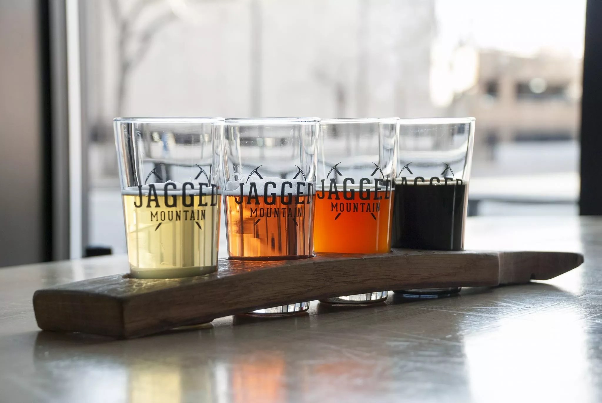 Plenty of breweries in Colorado use curved barrel staves as taster trays, which is a great idea – and right on theme. Jagged Mountain has some particularly nice ones.