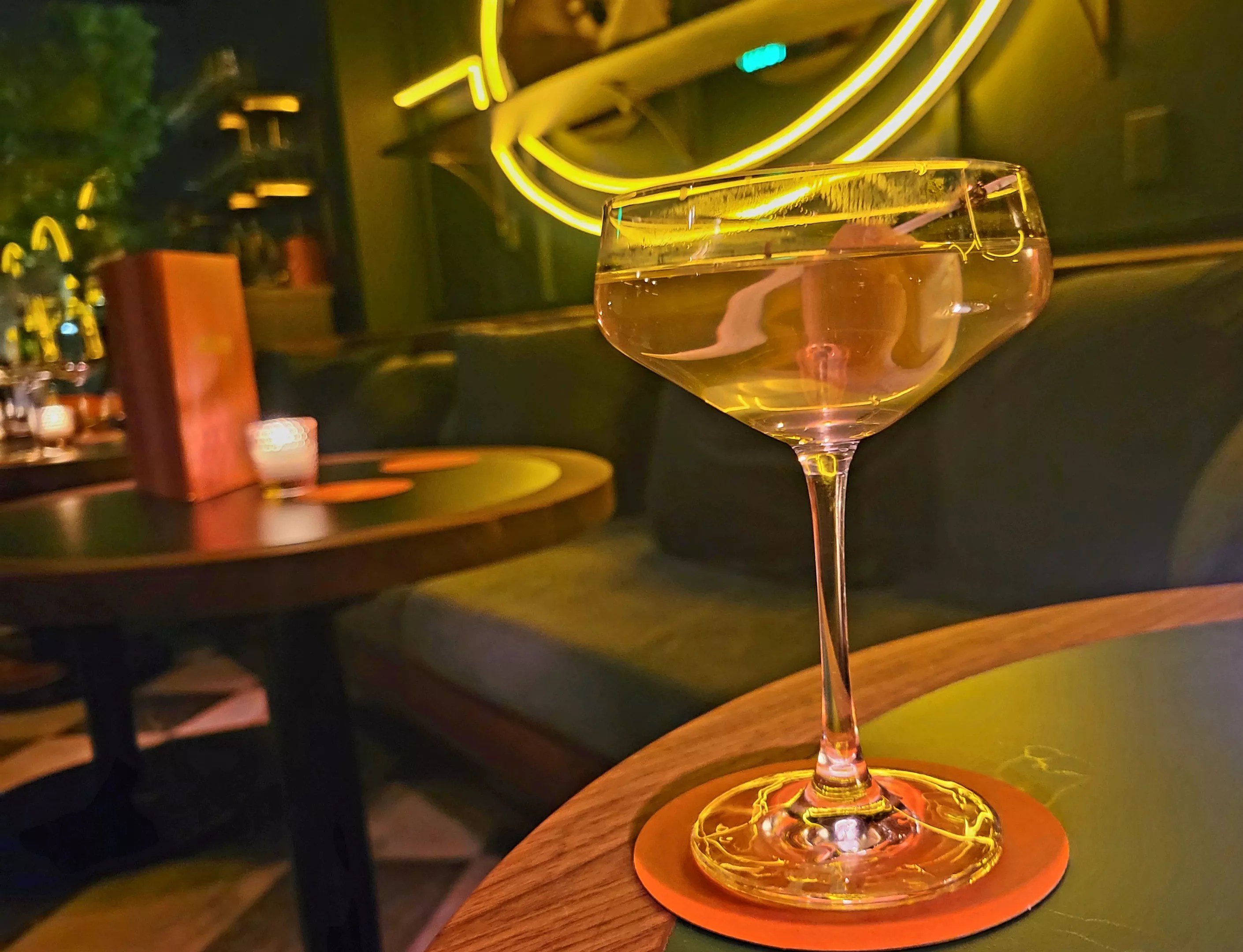 The tables along the banquette are small but well spaced, better for a duo than a large party. Bigger groups should plan to take up the high-top community table. While not quite as cozy, this spot has plenty of bonus room for plates of food. Two half-moon bars also offer seating options, one on each end of the room. With so many different spaces to inhabit in the mid-sized bar, it feels like you’re getting a different experience depending on where your party parks for the evening.