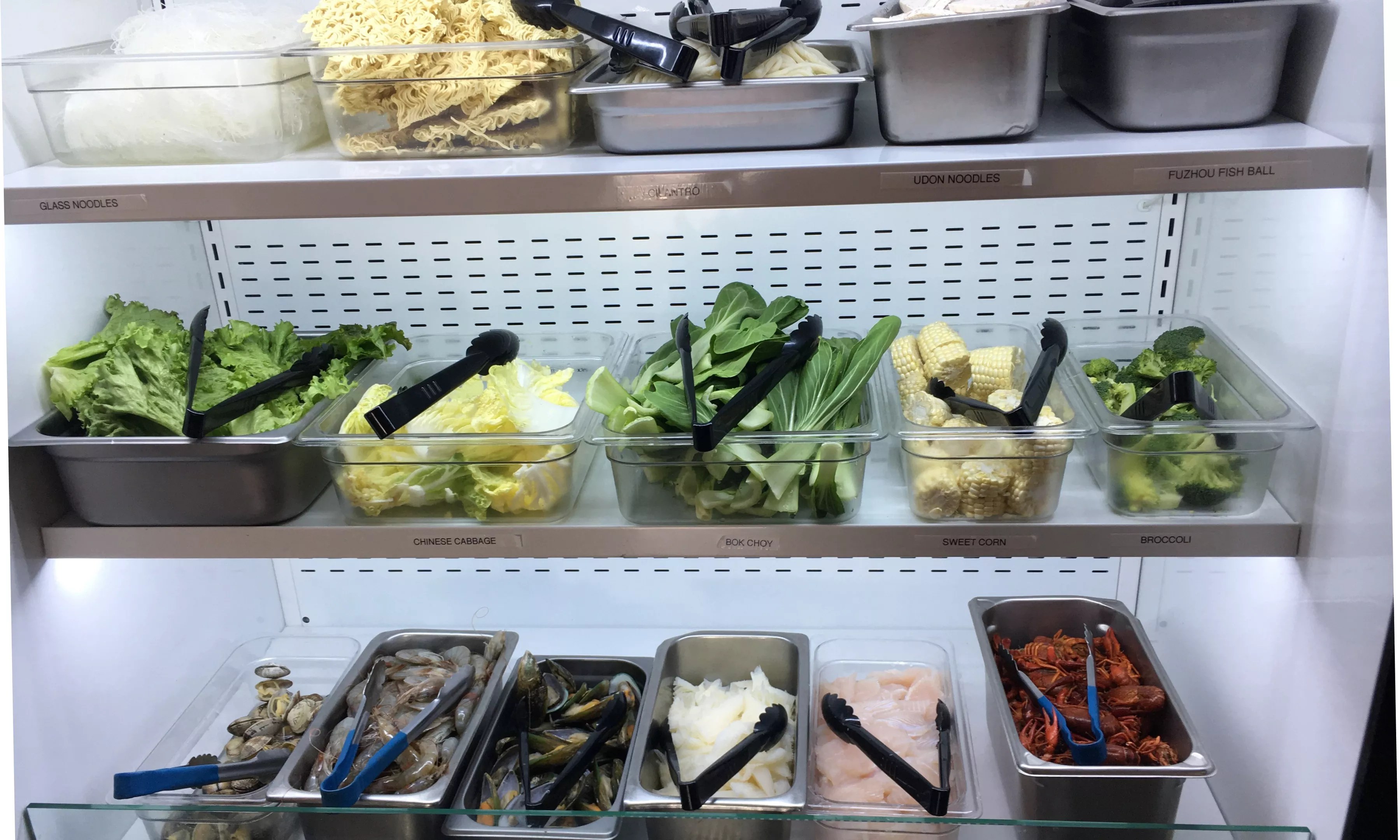 Squid, clams, whole shrimp, crawfish and other seafood are available at this station, which resembles a grab-and-go cold case in a convenience store. It also stocks such delicacies as tofu skin, tripe, fish balls, green-lip mussels, glass noodles and “fish tofu,” a firm fish cake cut into cubes to resemble bean curd. On the veggie side, rounds of lotus root, taro and potato sit alongside wood-ear mushrooms, bok choy, Chinese cabbage and other greens.