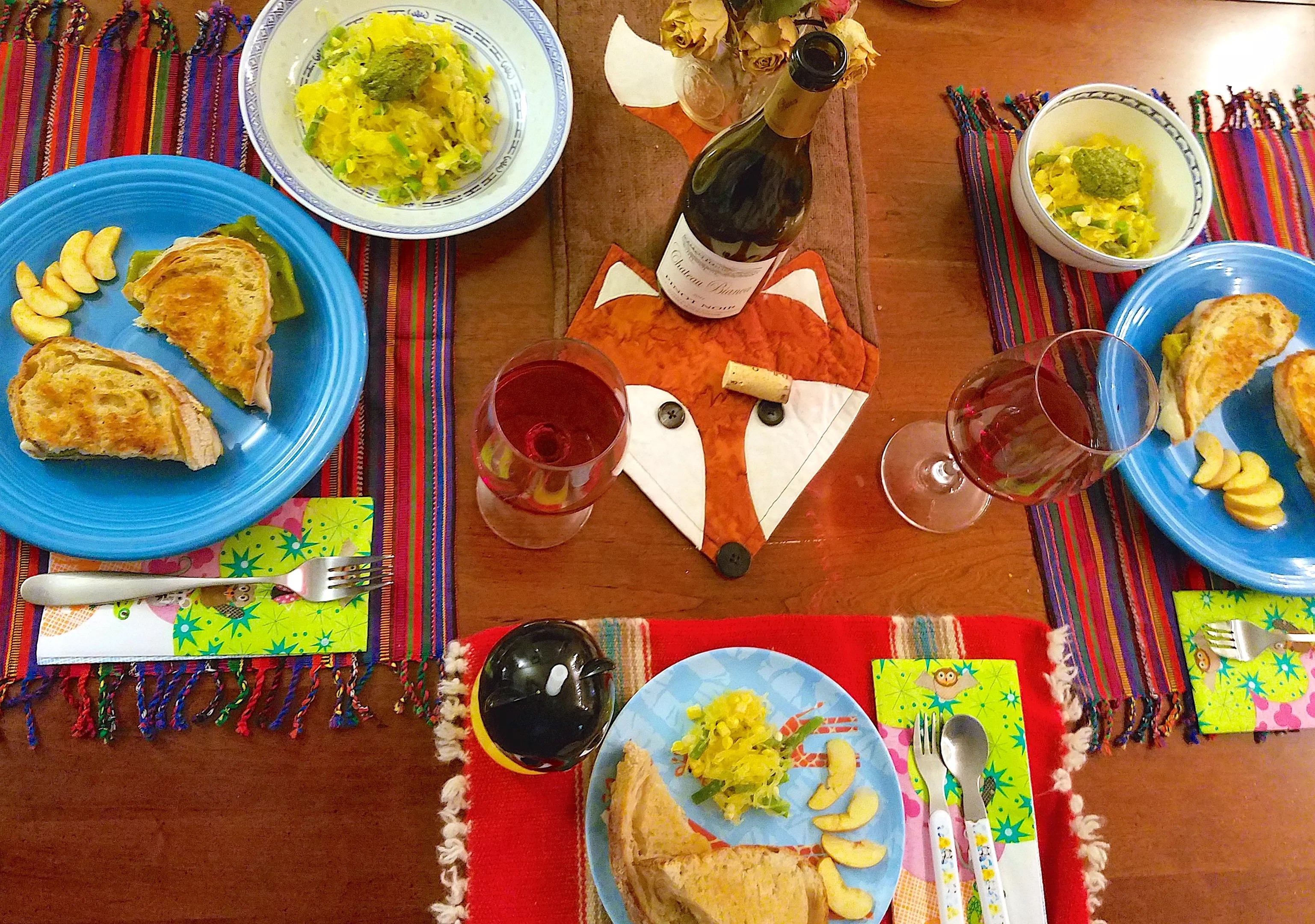 While the final dinner spread didn’t turn out as glamorous as some of the dishes we have featured in this column from professional chefs, it sure tasted good, and my three-year-old ate her whole sandwich and tried the veggies. In my book, that equals success. It was also great to see how big and bustling the Longmont Farmers’ Market is in comparison to the Union Station market. If you get a chance, go visit this location before the end of the season. Ta-da! I made a light succotash with roasted spaghetti squash, beans, a little bit of butter, salt and some raw sweet corn. Then, to tie it all together, it got a dollop of pesto on top. Linnea Covington Family dinner for three with all of the food from the Longmont Farmers’ Market save for the wine, butter, salt and pepper. Linnea Covington