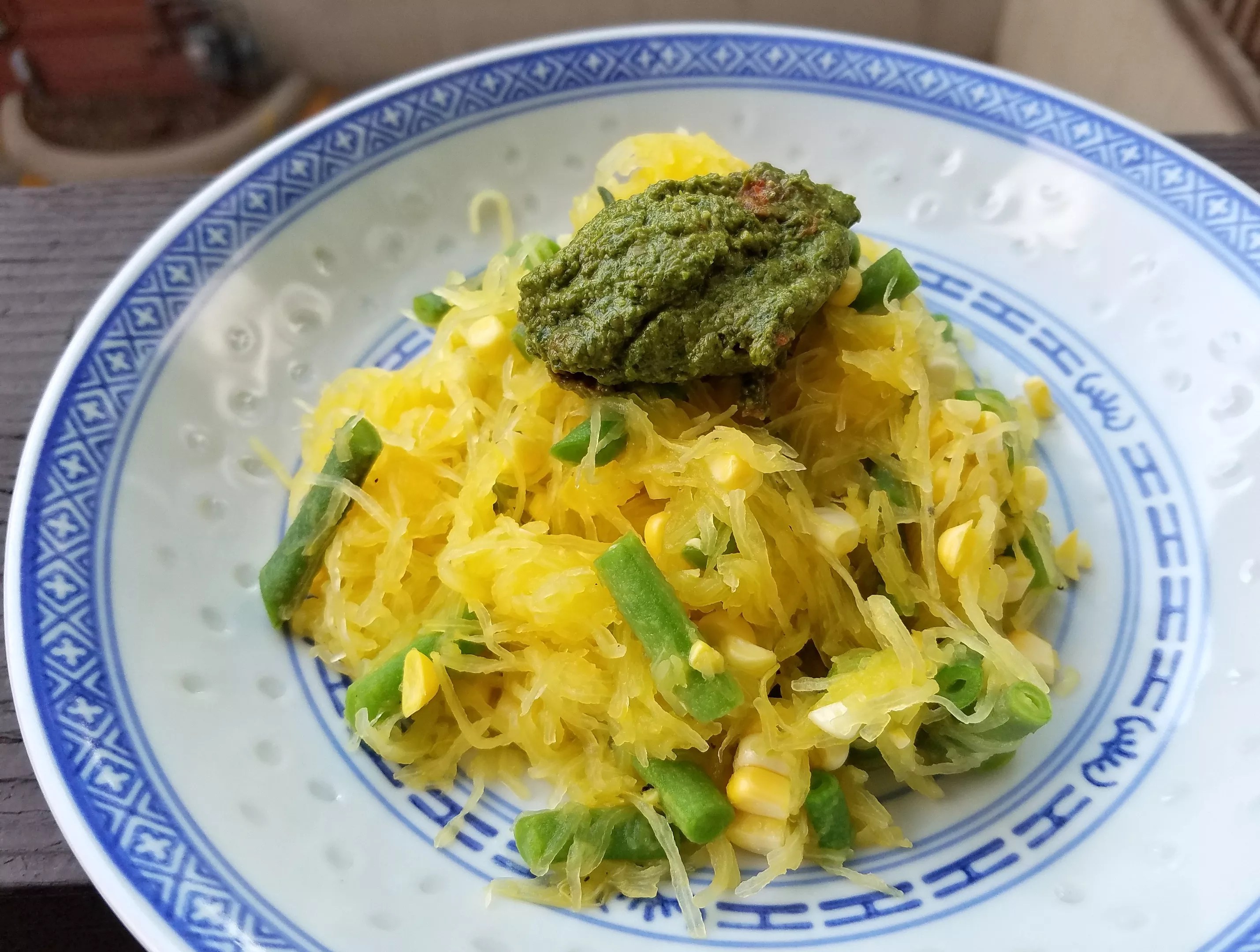 At home I roasted the squash at 400 degrees for 40 minutes and then scooped it out of the skin and combined it with quartered and steamed green beans and freshly shucked corn kernels. A tablespoon of butter got melted into the pot and mixed with a pinch of salt and a dash of pepper. Then I topped it with a spoonful of the arugula pesto. For the sandwich I put a whole roasted chile in between layers of cheese and then added some of the sweet and crisp apple to the side to help counteract the spice. Cleavers aren’t just for meat! Try using yours to cut into a big squash like this spaghetti squash. Linnea Covington