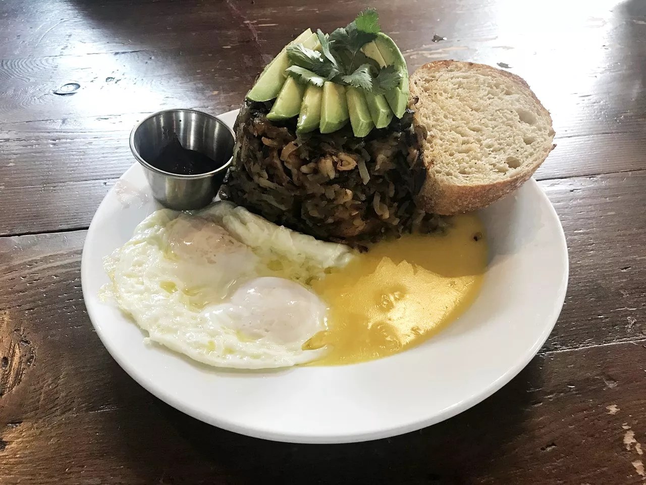The menu is filled with Benedicts and omelets (three kinds of each, in fact), but the hashes stand out as a draw for hearty appetites. One of them is a Tender Belly pork-belly hash wih crispy pork, hash browns, fire-roasted poblanos, cilantro and avocado, along with two sunny side-up eggs and crostini. A pool of Hollandaise adds a little something to drag your fork through.