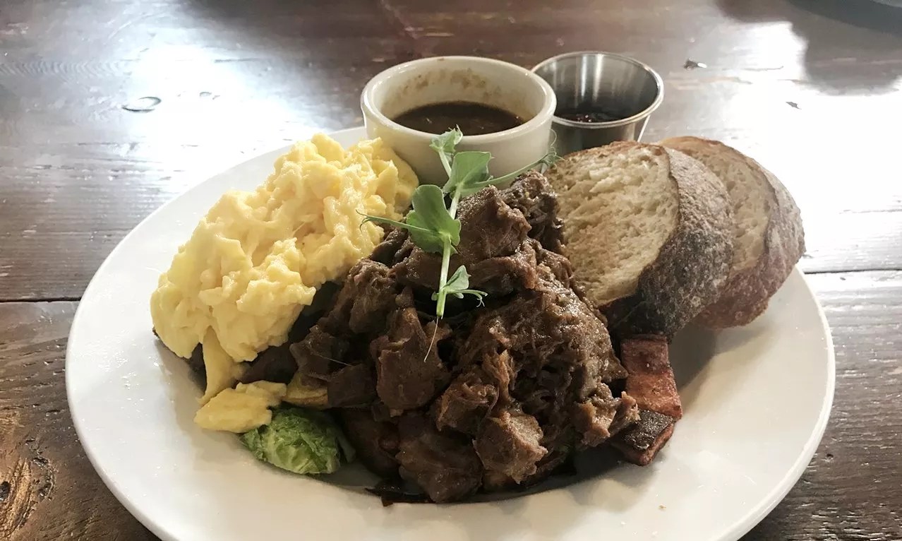 The pot roast scrambler isn’t the kind of thing you’d whip up at home – unless you get up six hours early to slow-cook the beef. That’s how long Fooducopia takes to make the pot roast for this dish, which also comes with scrambled eggs, Brussels sprouts, broccoli, squash and sweet potatoes, all cooked separately and layered on the bottom of the dish. A side of sauce, thickened with puréed vegetables instead of flour, comes with the lean and tender beef.