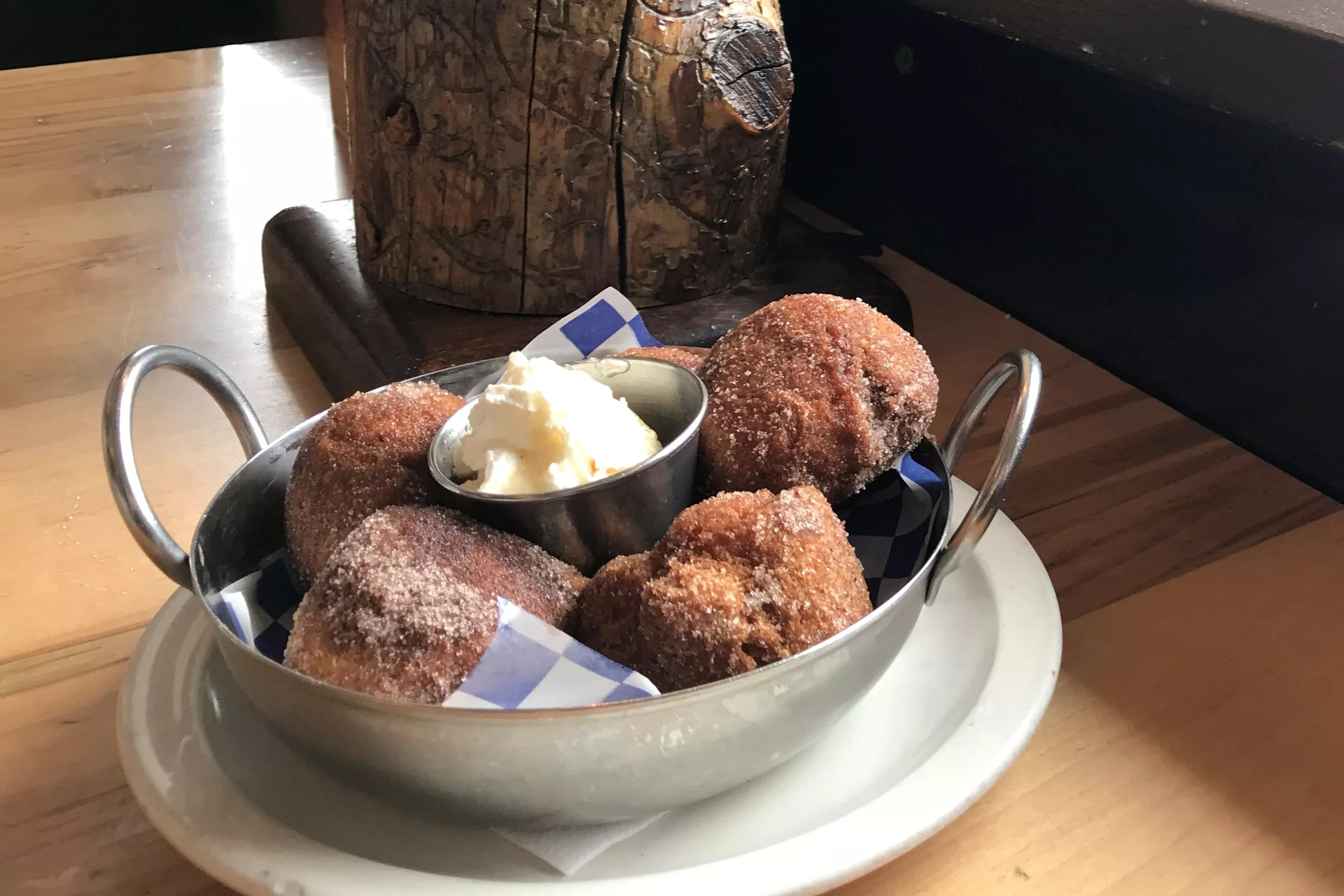What goes well with beer? The cinnamon-sugar doughnuts were calling to me because they combine my three favorite words: cinnamon, sugar and doughnuts. More enticing words: maple syrup whipped cream, which comes on the side and spreads on so easily over the warm spheres (these doughnuts don’t have holes).
