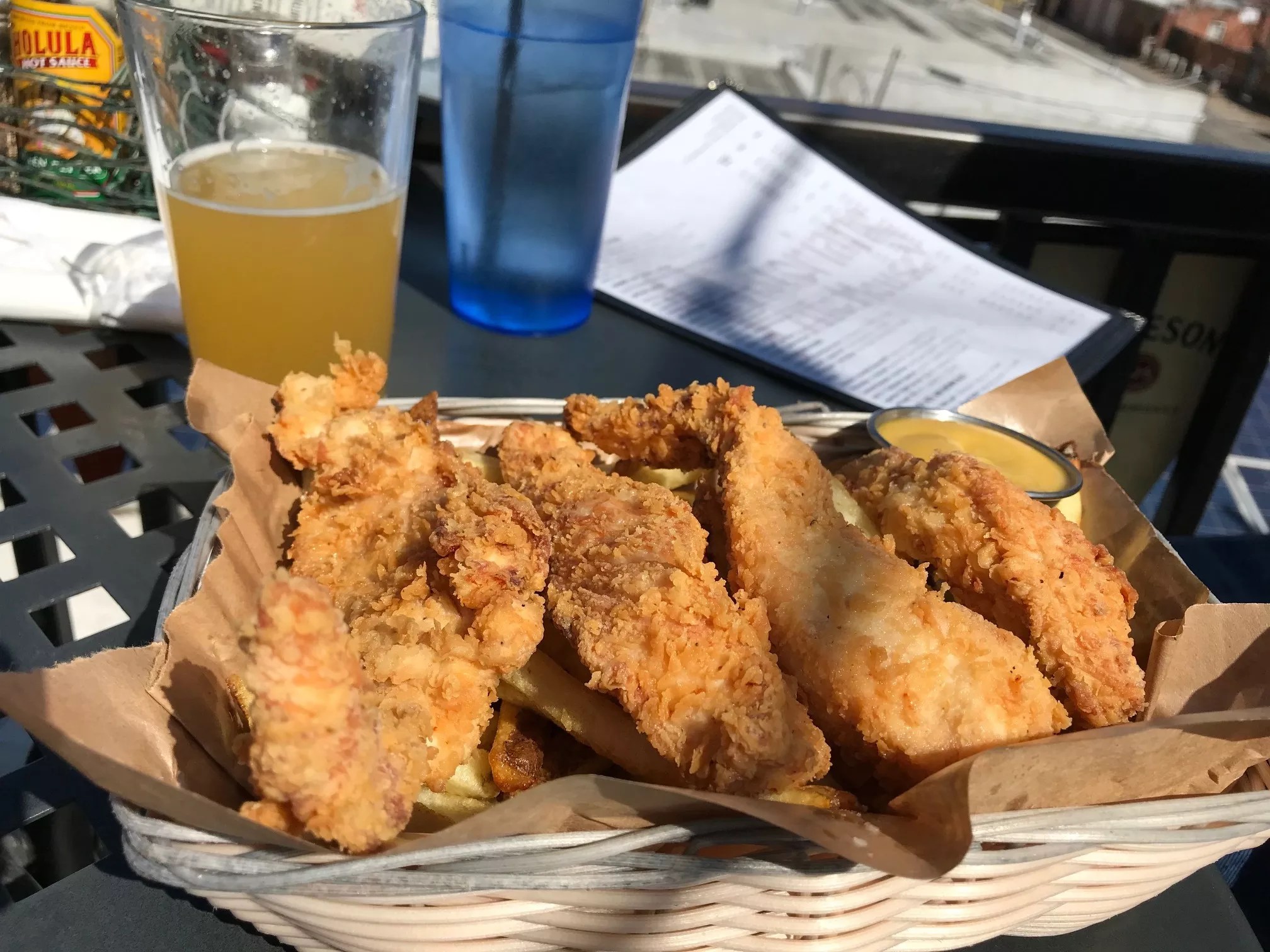 Brunch also includes several lunch items, like a basket of hand-trimmed and breaded chicken strips that crunch loudly with each bite. There’s also a build-your-own burger that comes adorably wrapped up and tied with twine.